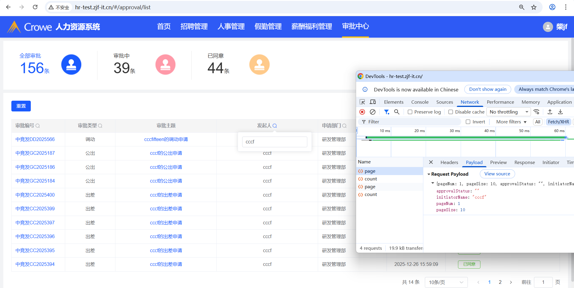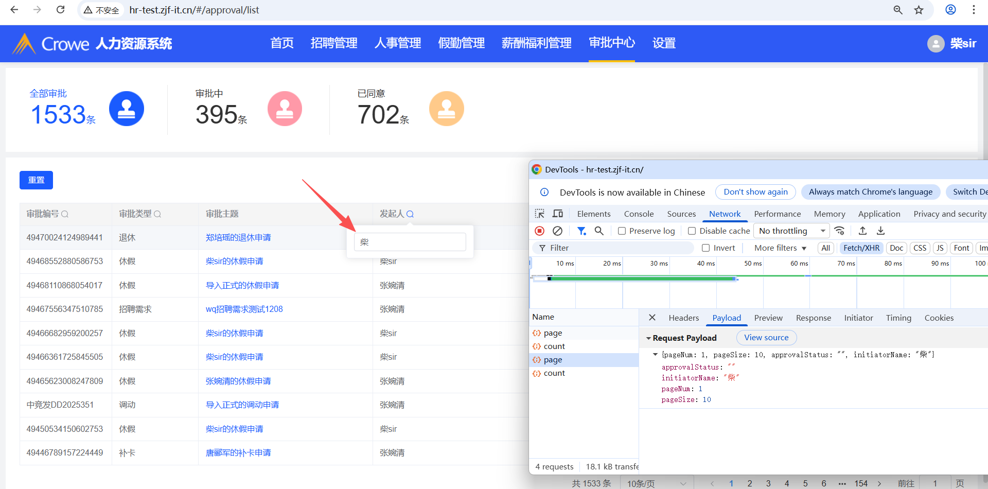 已关闭人力资源系统-审批中心,根据表头列:发起人筛选,筛选出来的数据不对