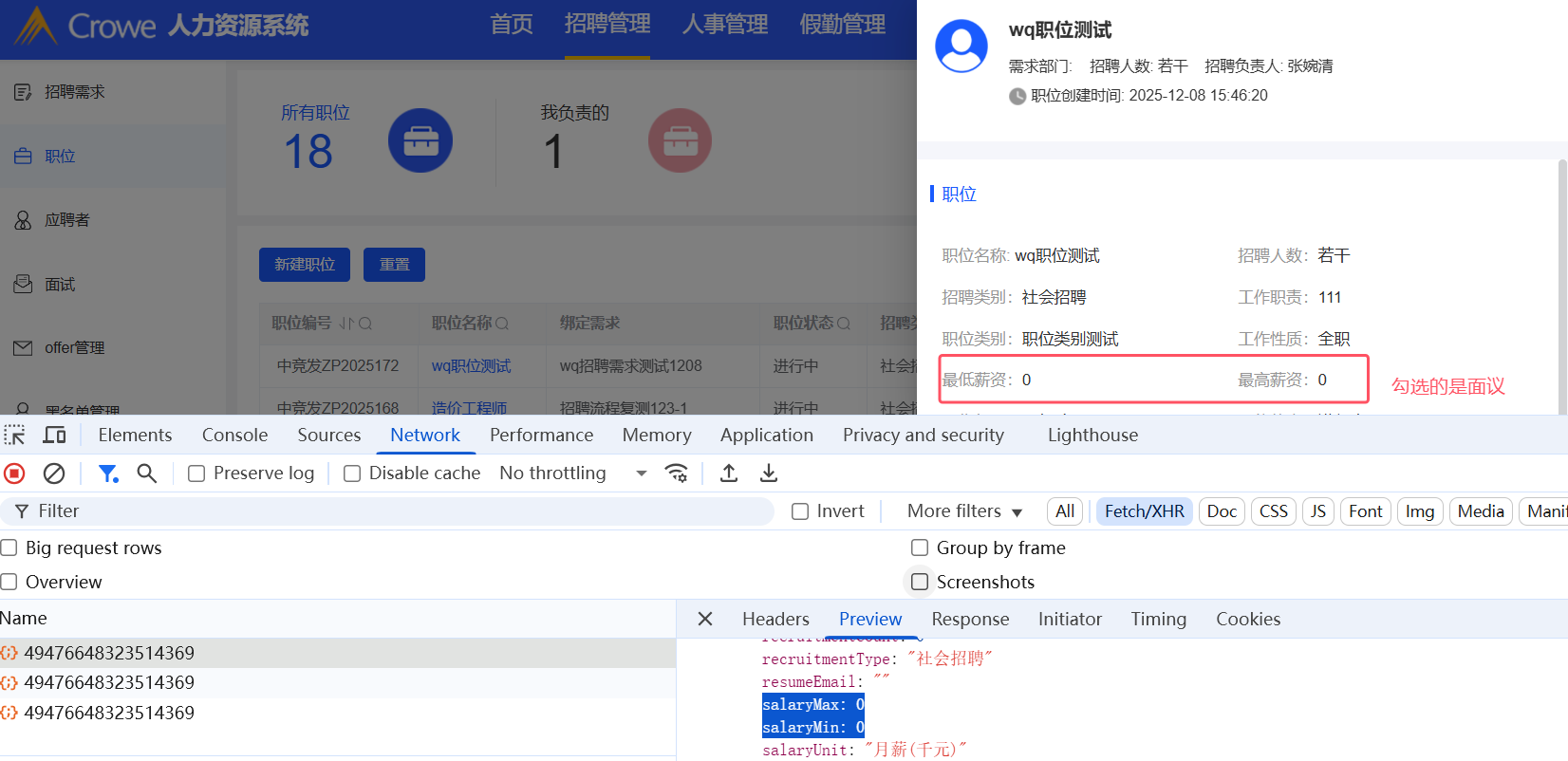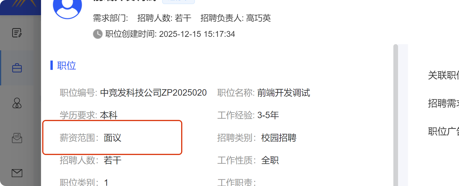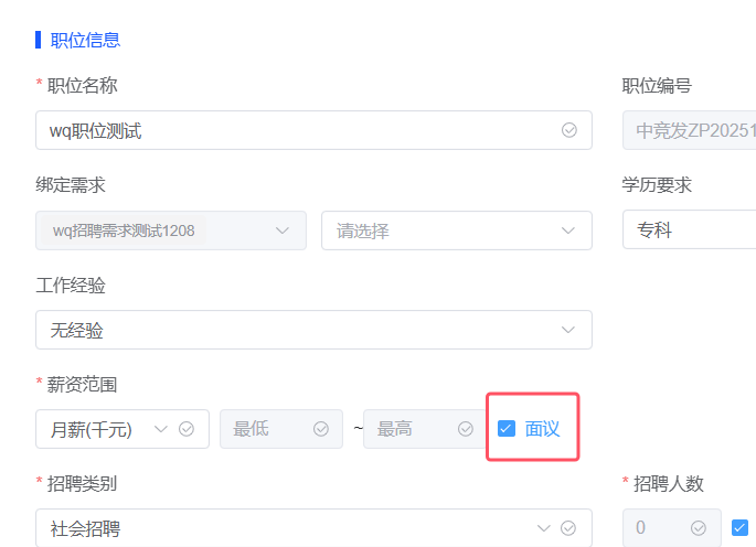 招聘管理-职位:职位中薪资范围勾选的面议时,点击职位名称显示的最低薪资和最高薪资为0