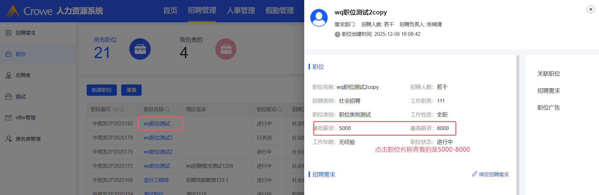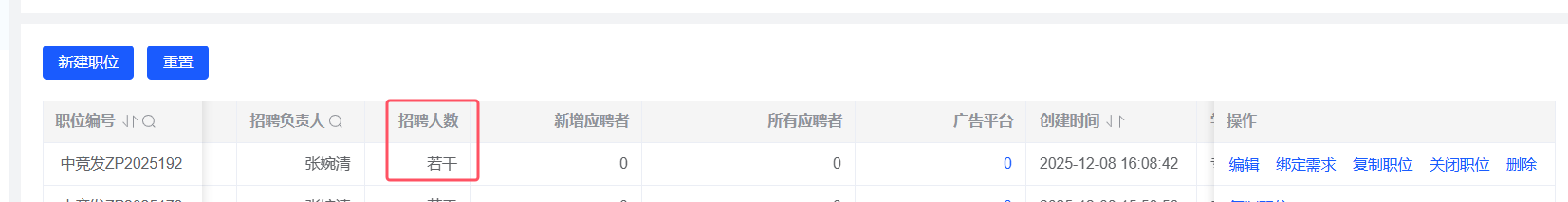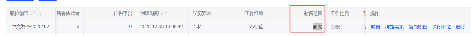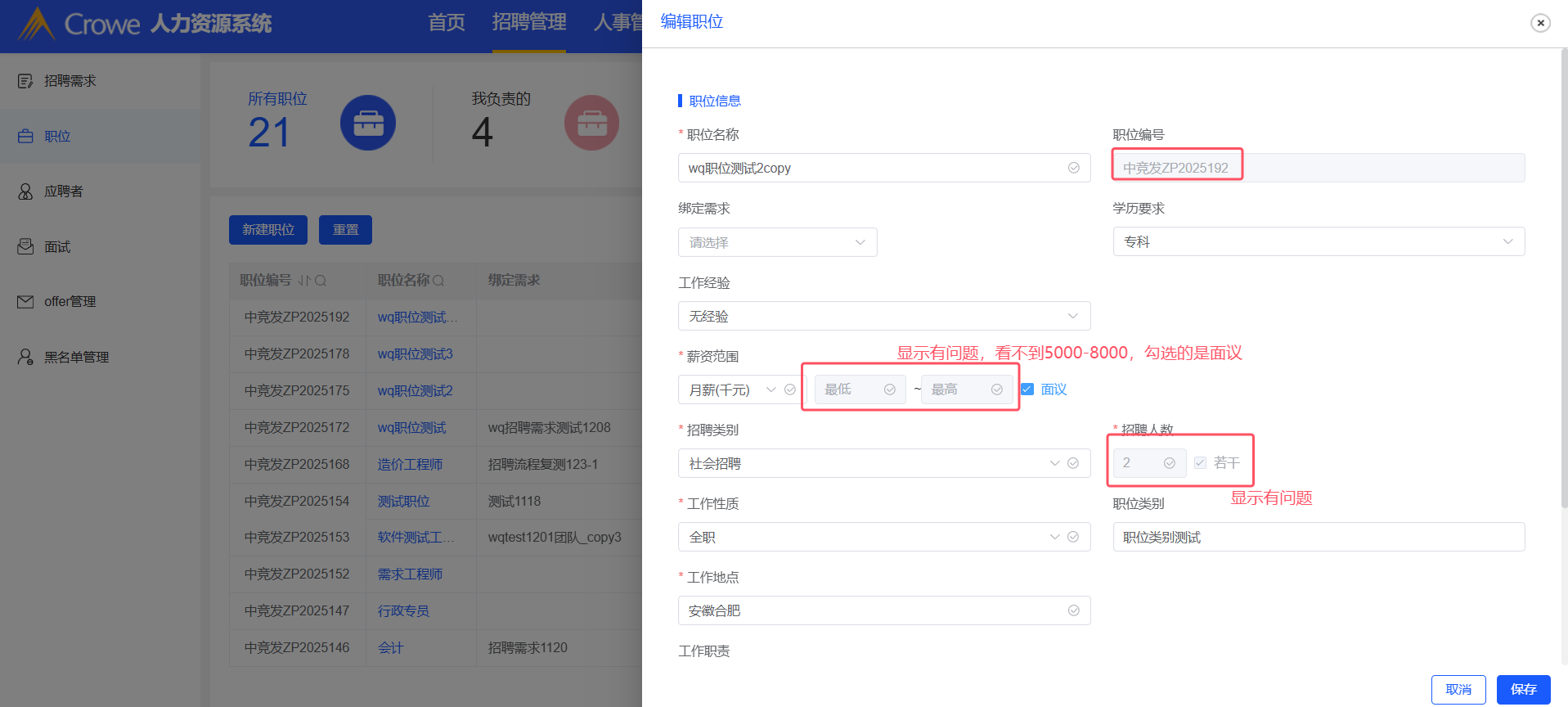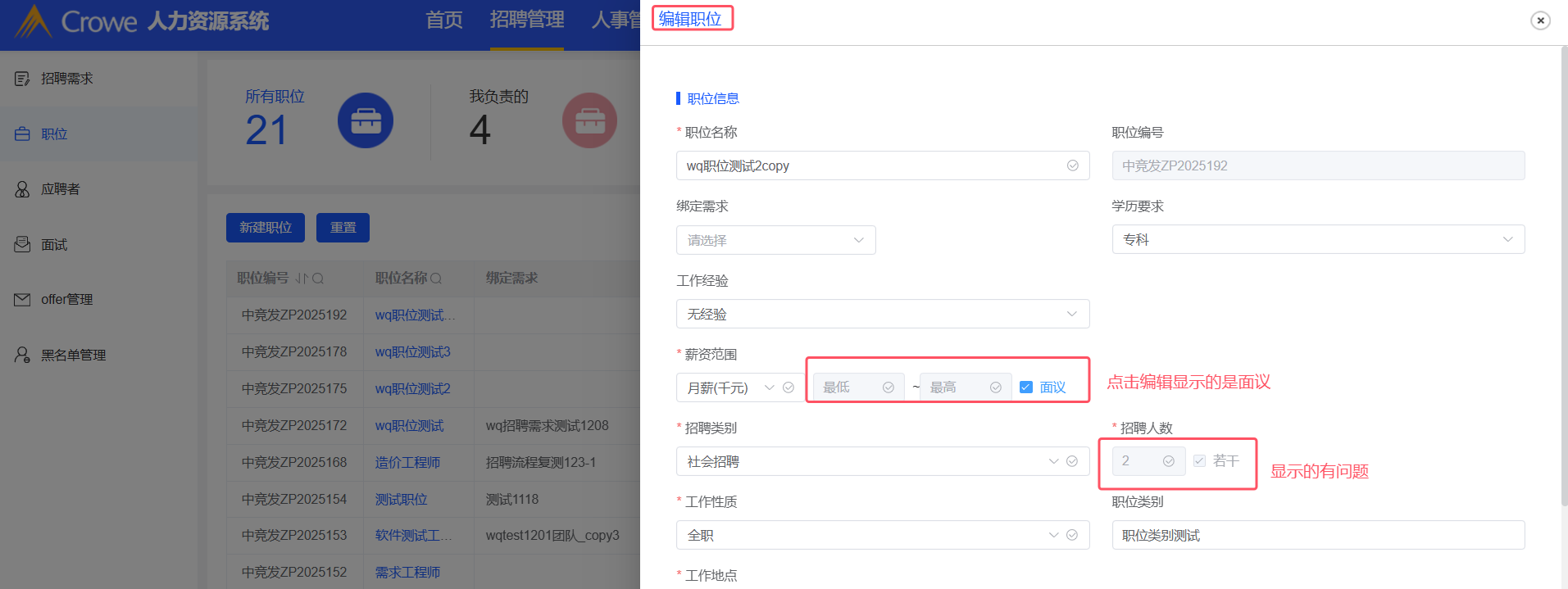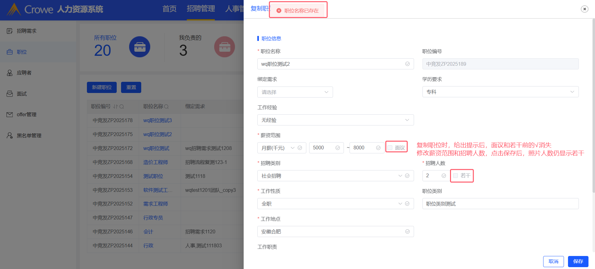 招聘管理-职位:复制职位,职位名称重复时给出提示,提示后面议和若干前的√消失,输入数字范围后点击保存,点击职位名称查看详情和编辑职位查看的详情不一致