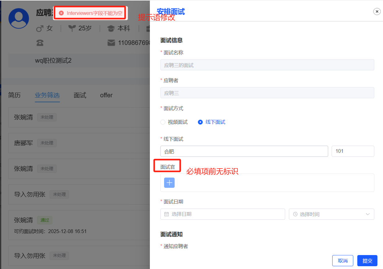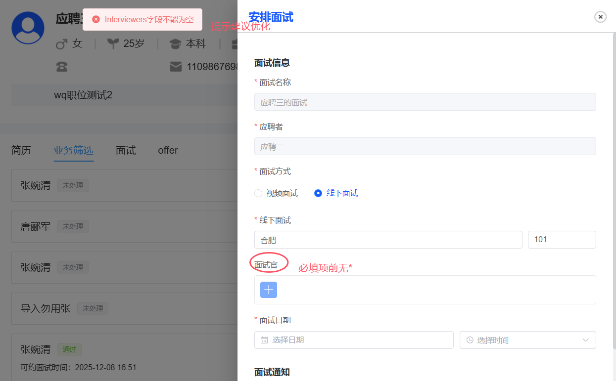 招聘管理-应聘者-安排面试:面试官必填项前无*标识,提示语建议优化