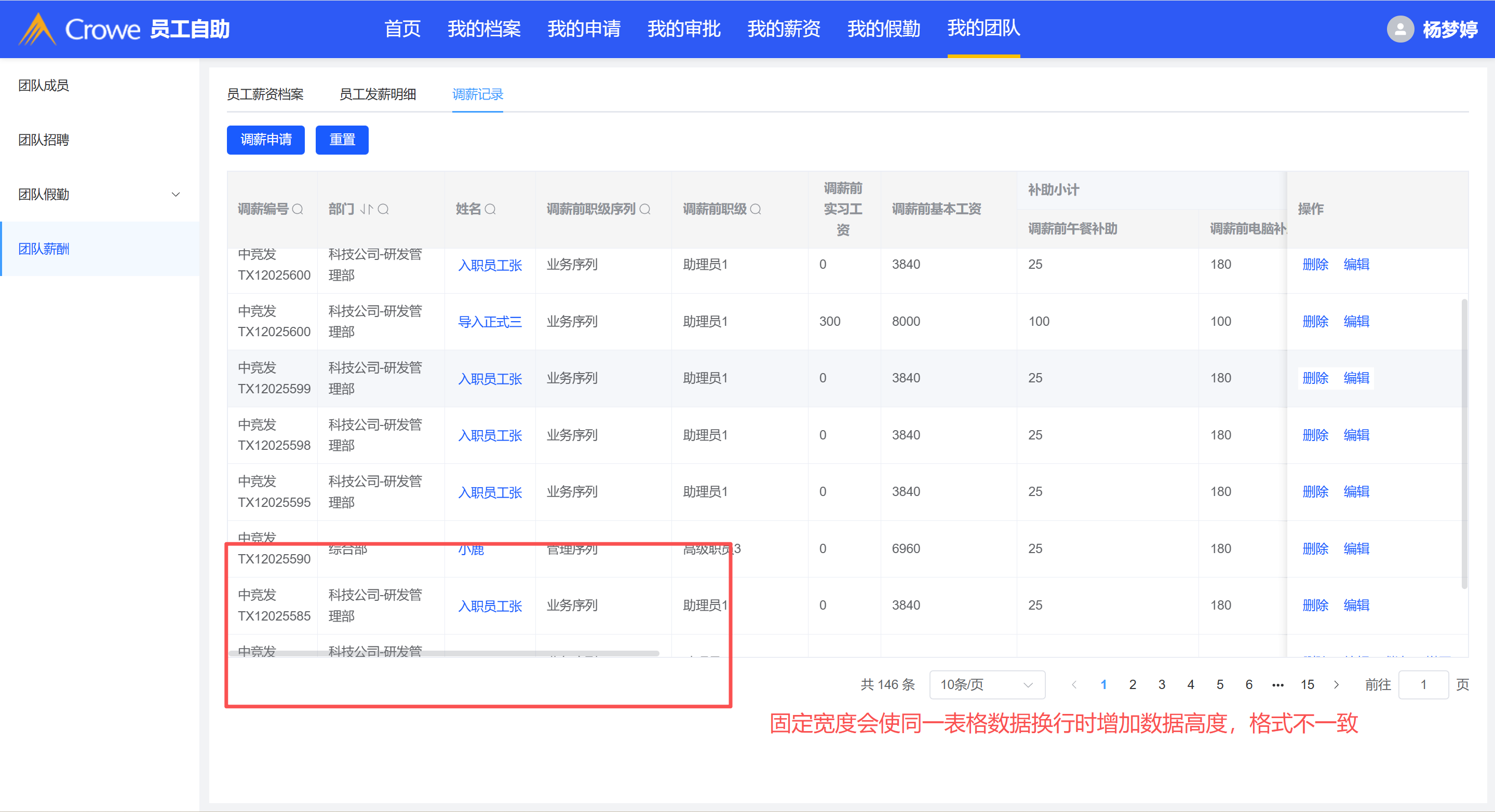调薪记录列表中,不同高度的数据宽度使数据展示不一致