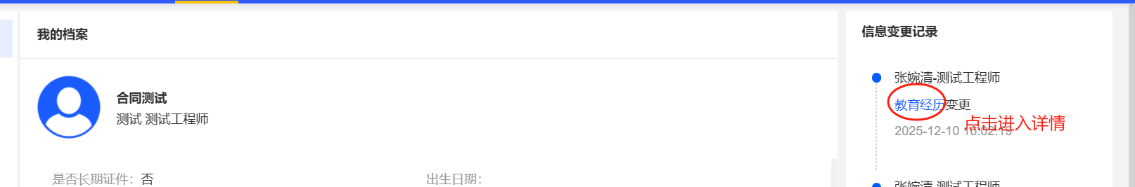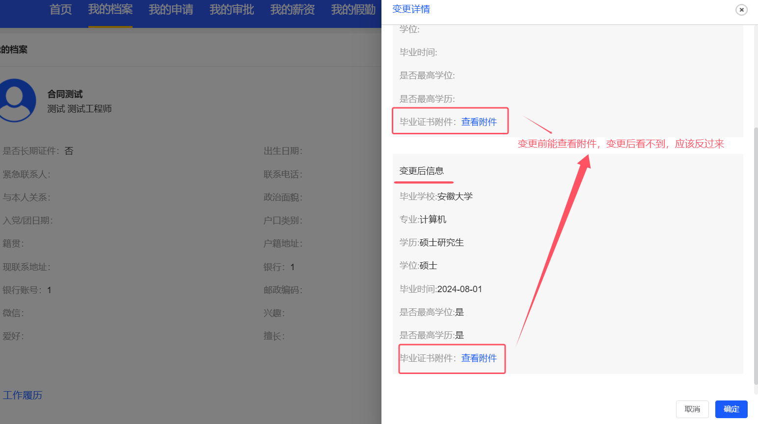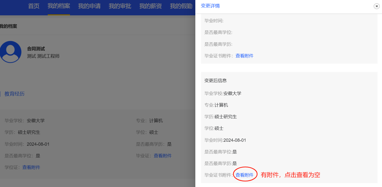 员工自助-我的档案:变更了教育经历,点击右侧信息变更记录查看详情,变更前可以查看附件,变更后查看空白,应该反过来
