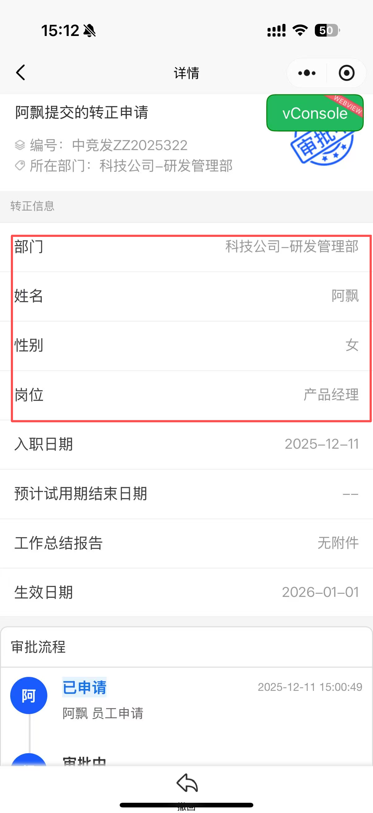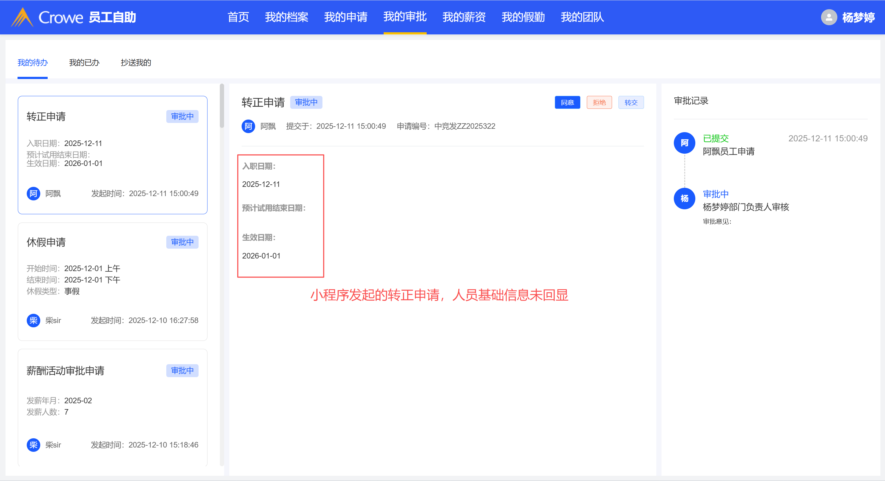 在小程序发起转正申请,人员的基本信息在pc端申请详情回显