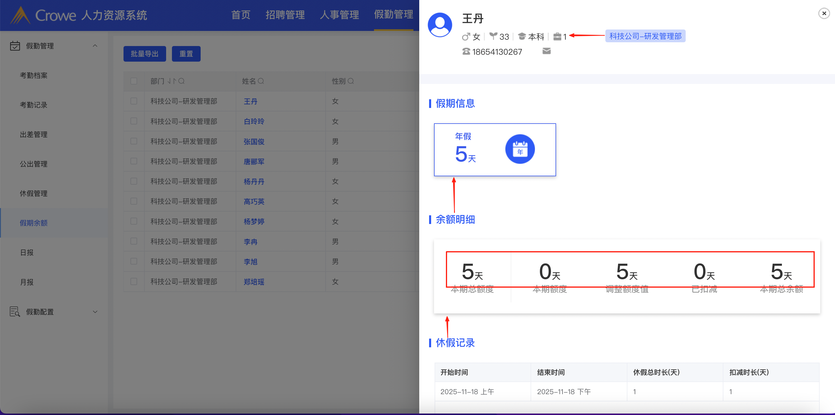 4.假期余额-假期余额个人详情弹窗 小标题和正文内容间距,正文文字间距 参考招聘管理-招聘需求-需求详情页面的间距保持统一,个人信息中,公司-职位信息向左移动,靠近,假期天数字体太粗了,调稍微细一点
