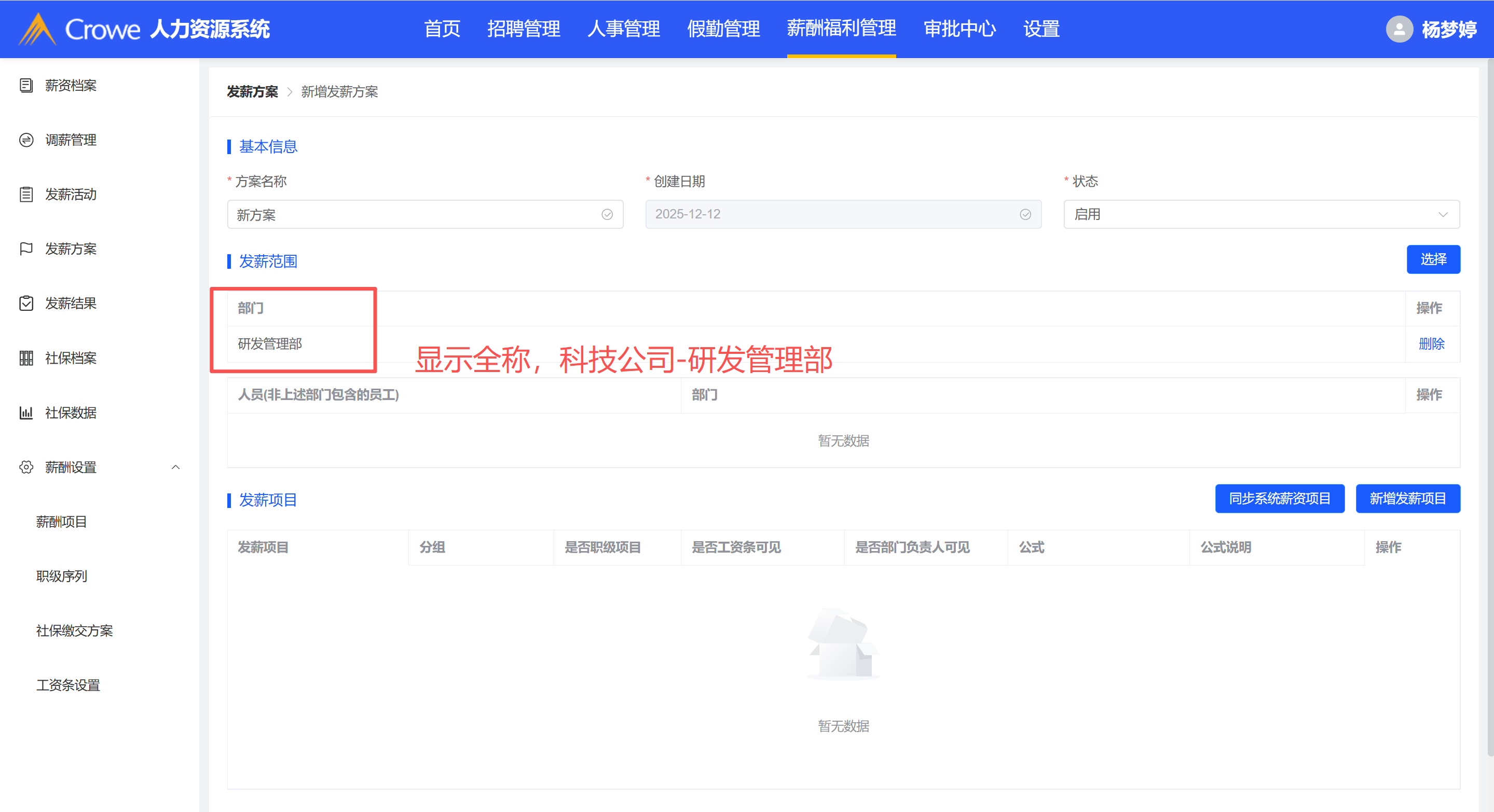 发薪方案选择部门,展示为全称:科技公司-研发管理部