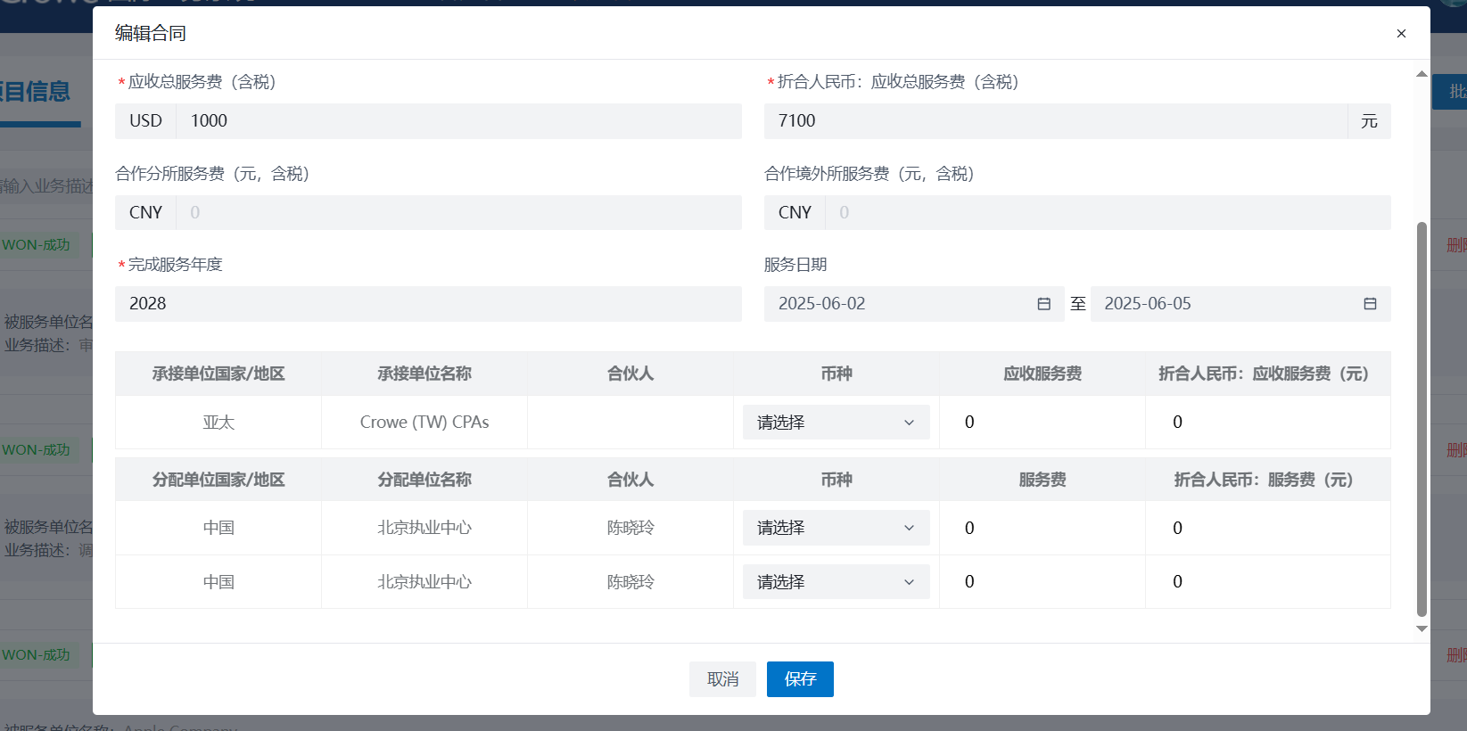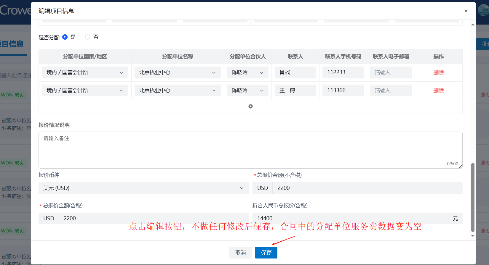 2、保存成功后,打开编辑合同,合同中的承接单位和分配单位收费数据被清空