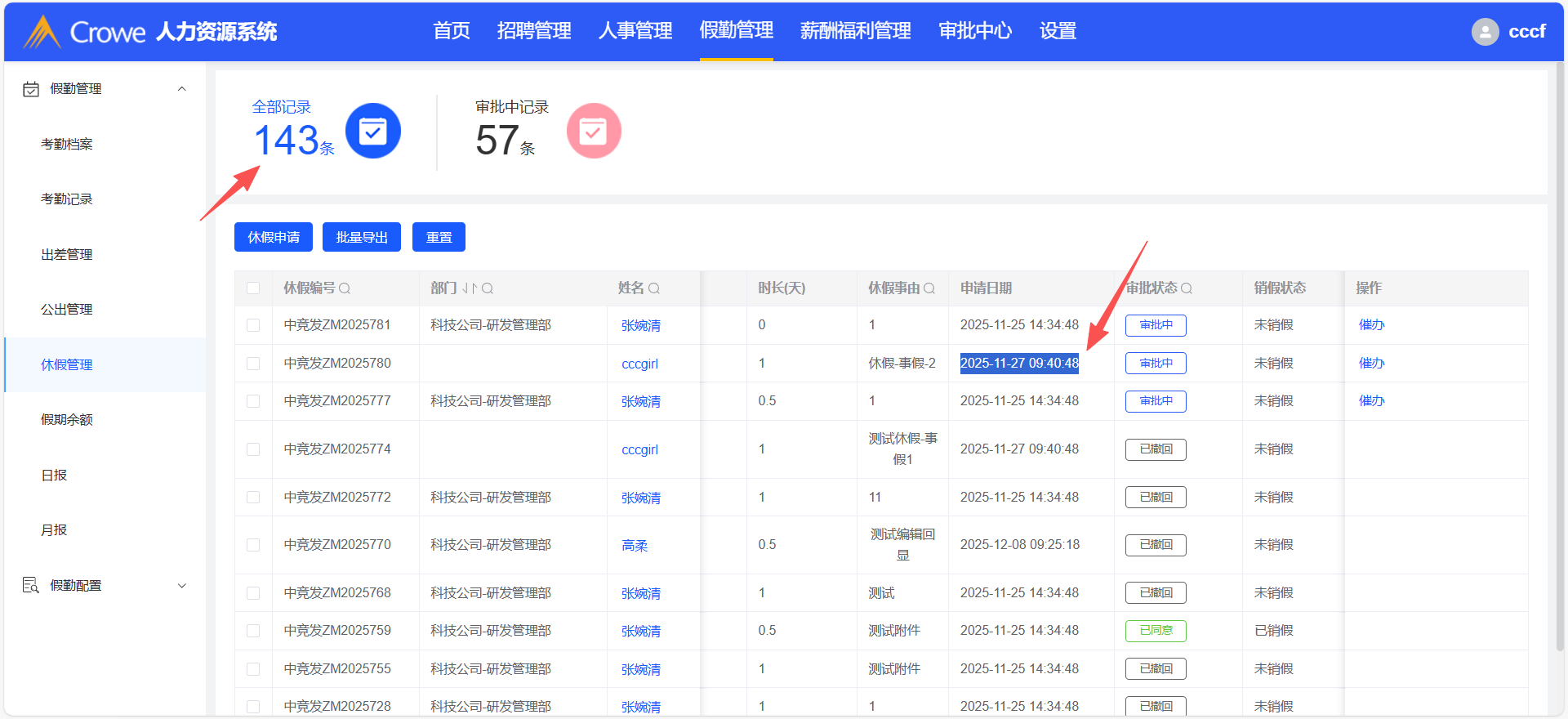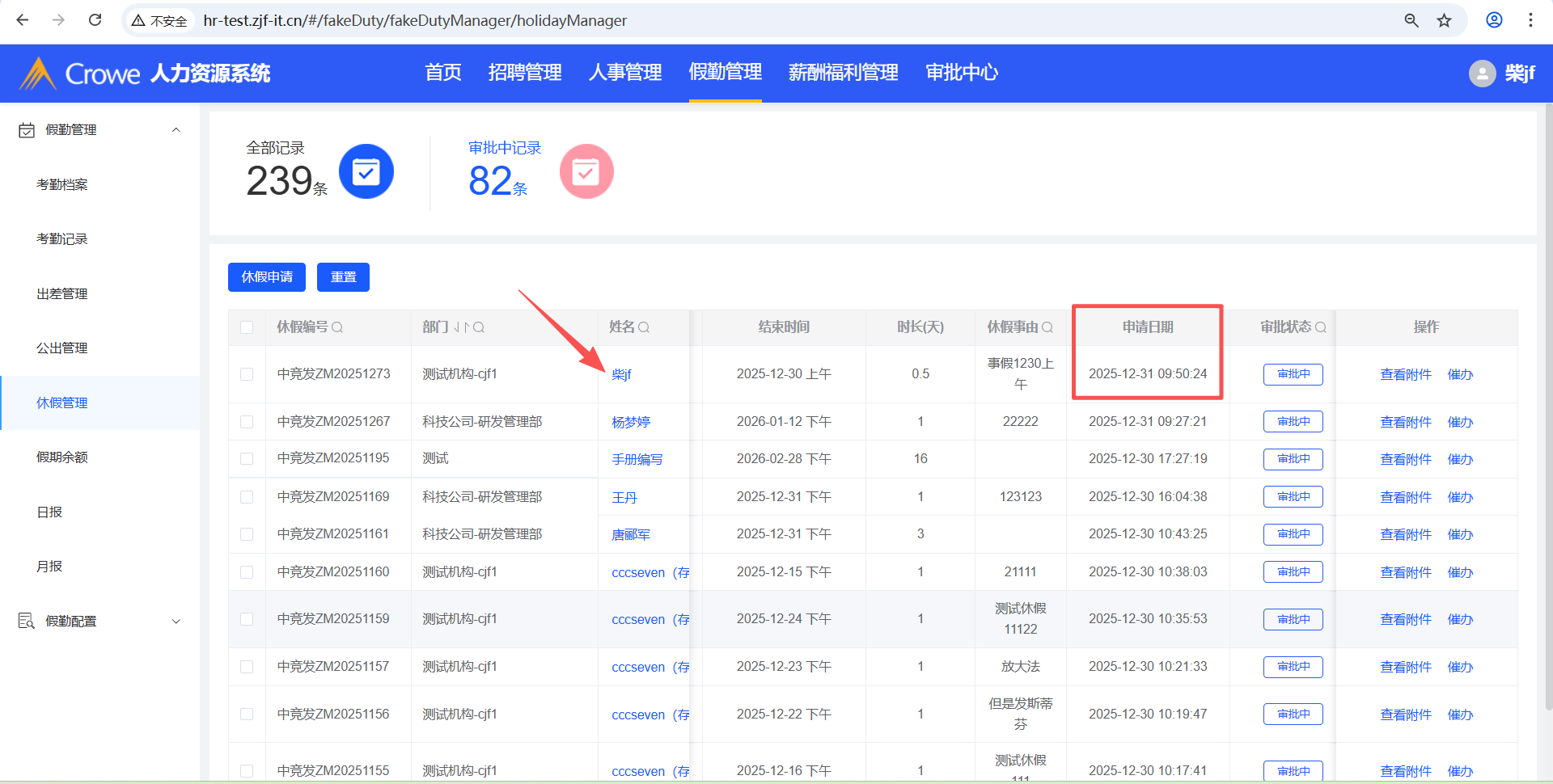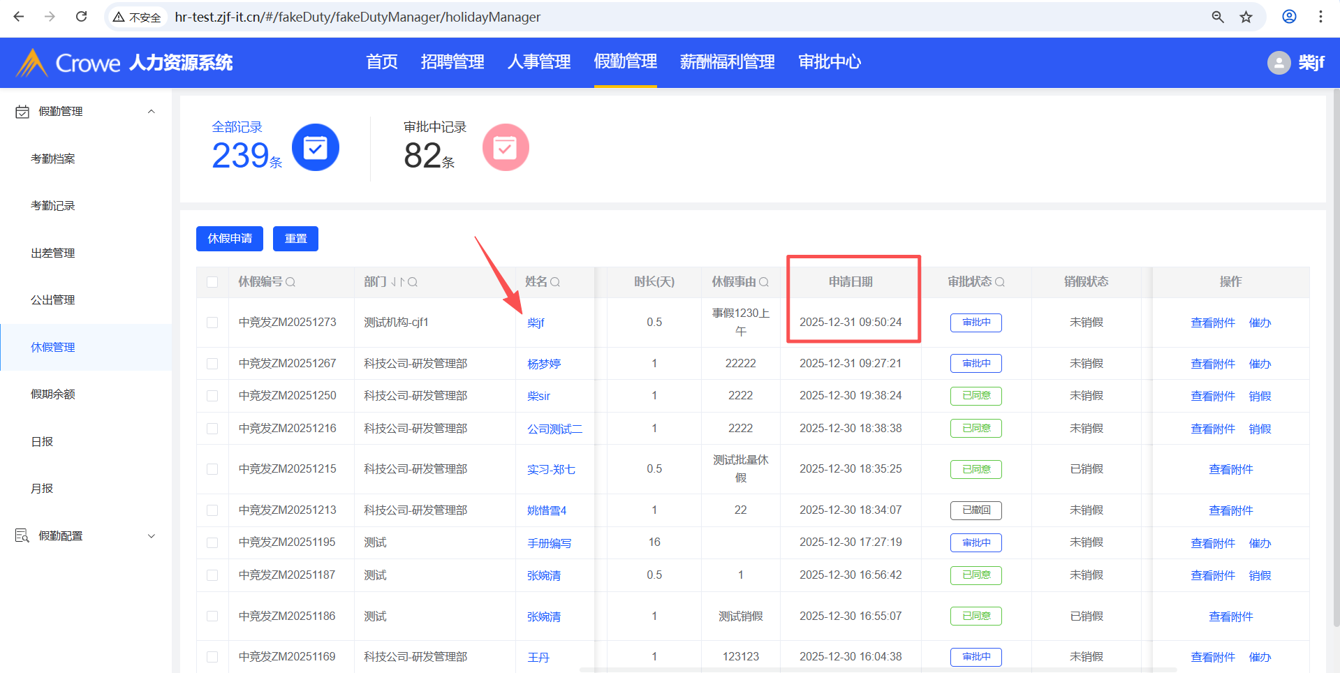 人力资源系统-假勤管理-休假管理,全部记录和审批中记录列表,列申请日期字段值显示不对
