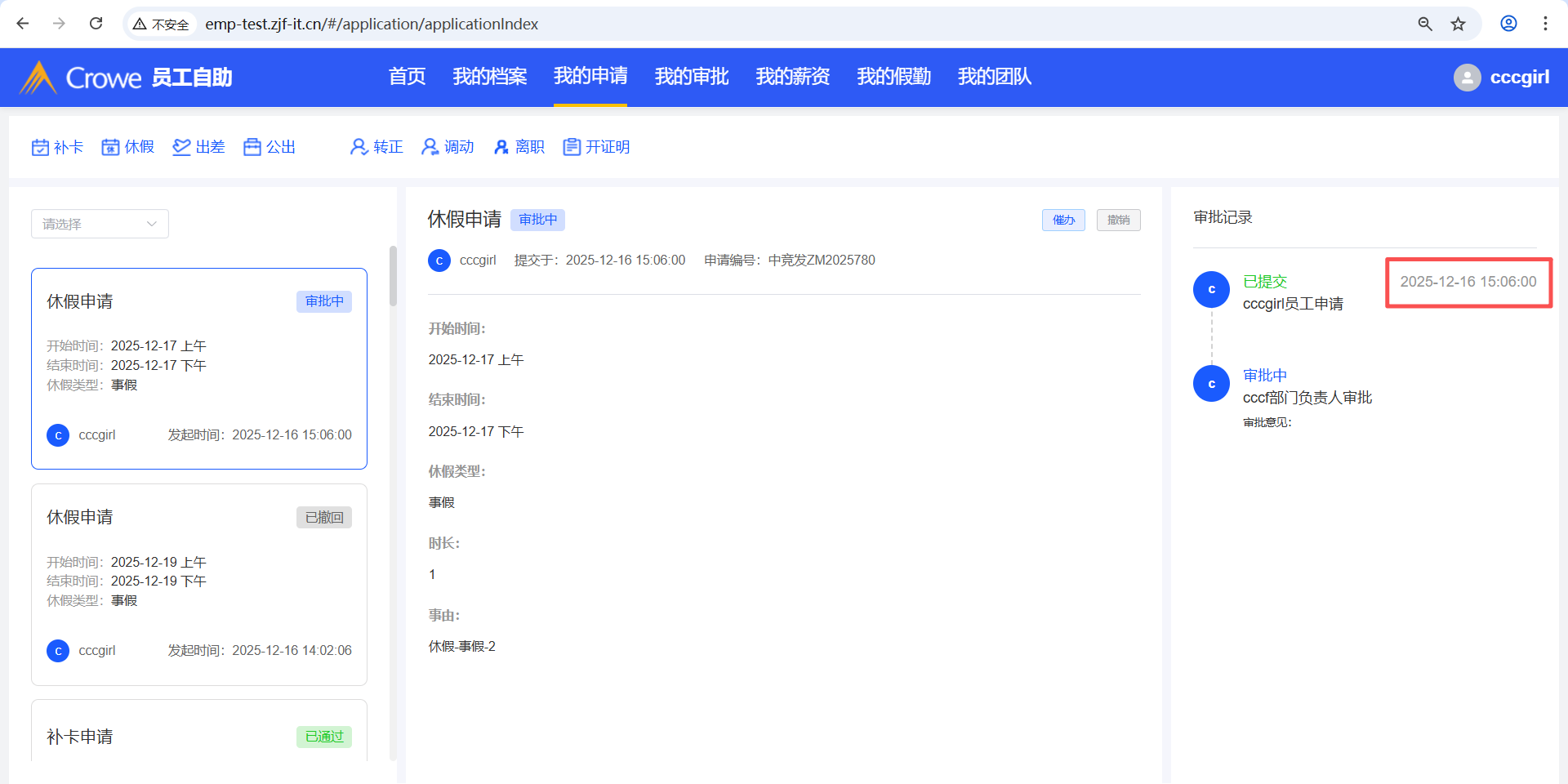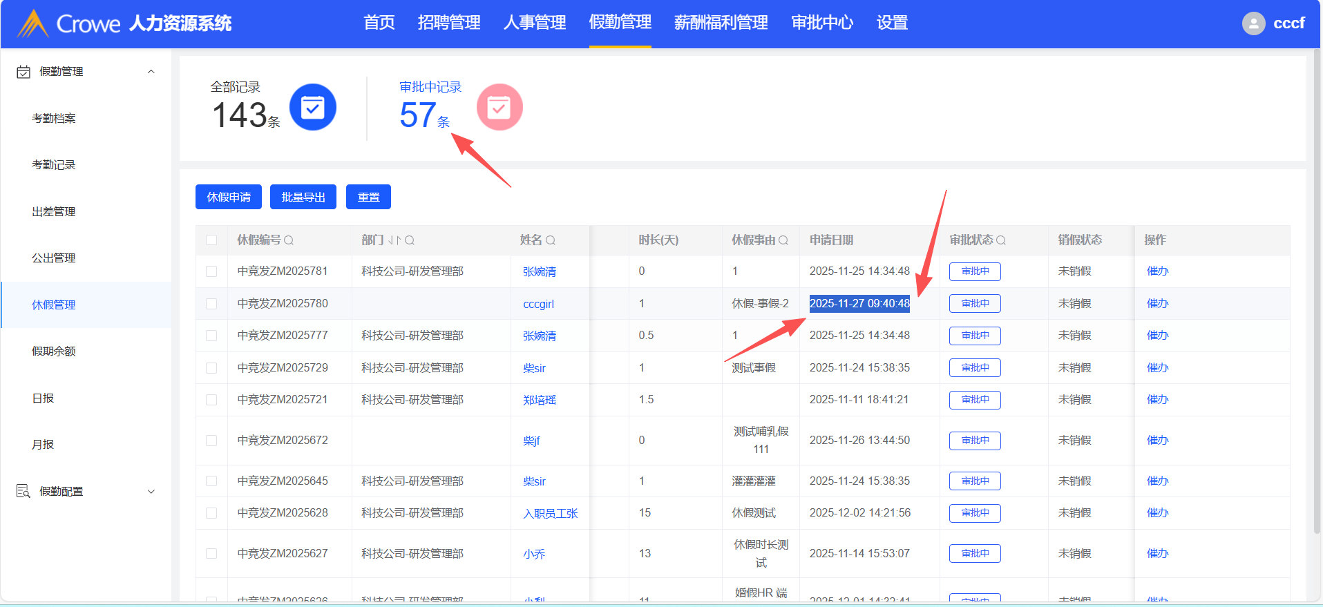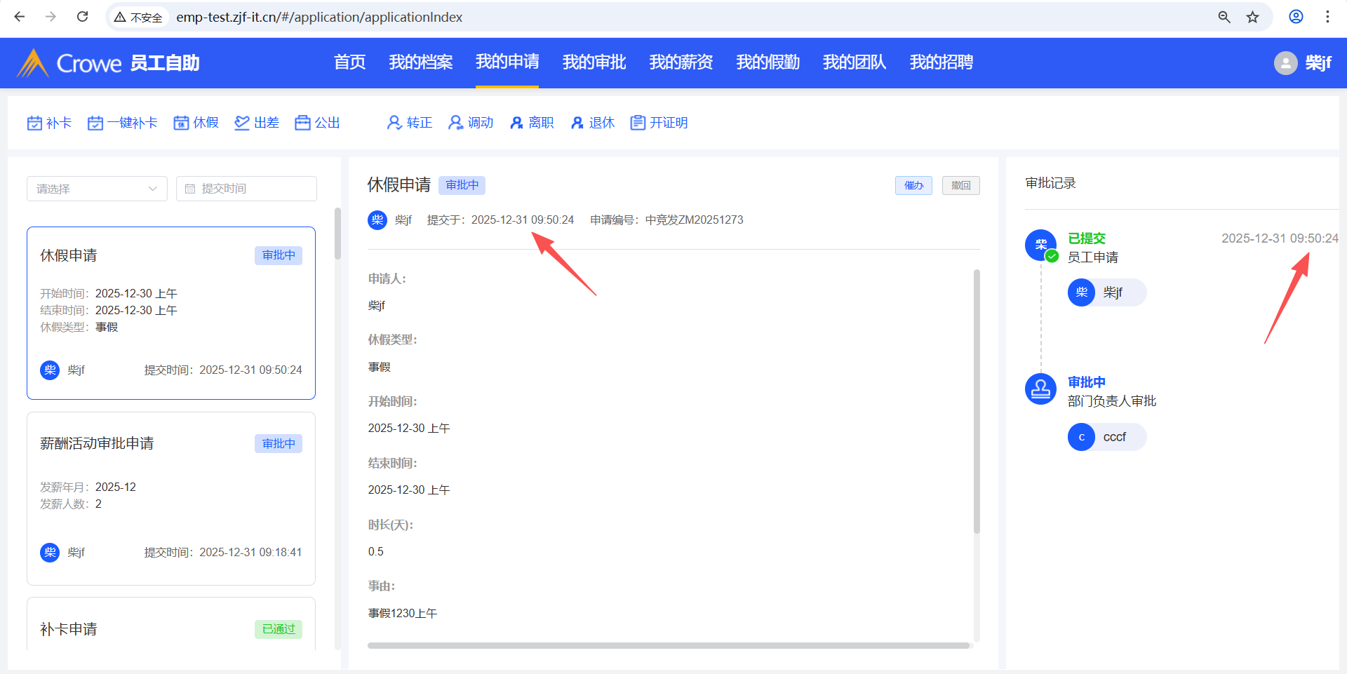 人力资源系统-假勤管理-休假管理,全部记录和审批中记录列表,列申请日期字段值显示不对