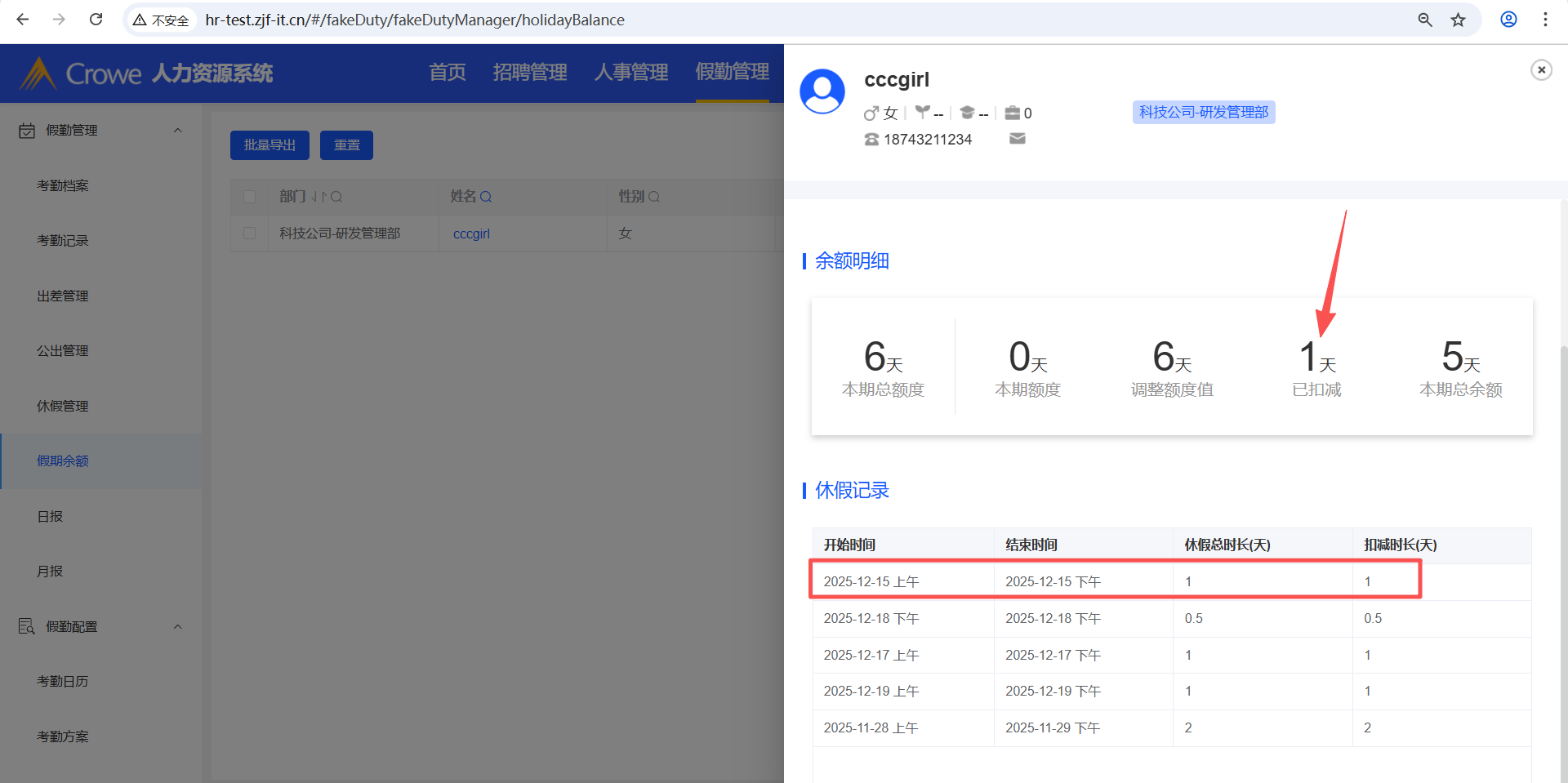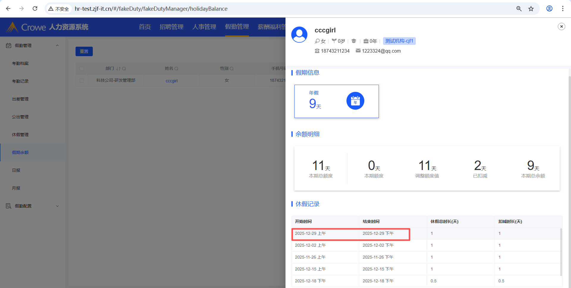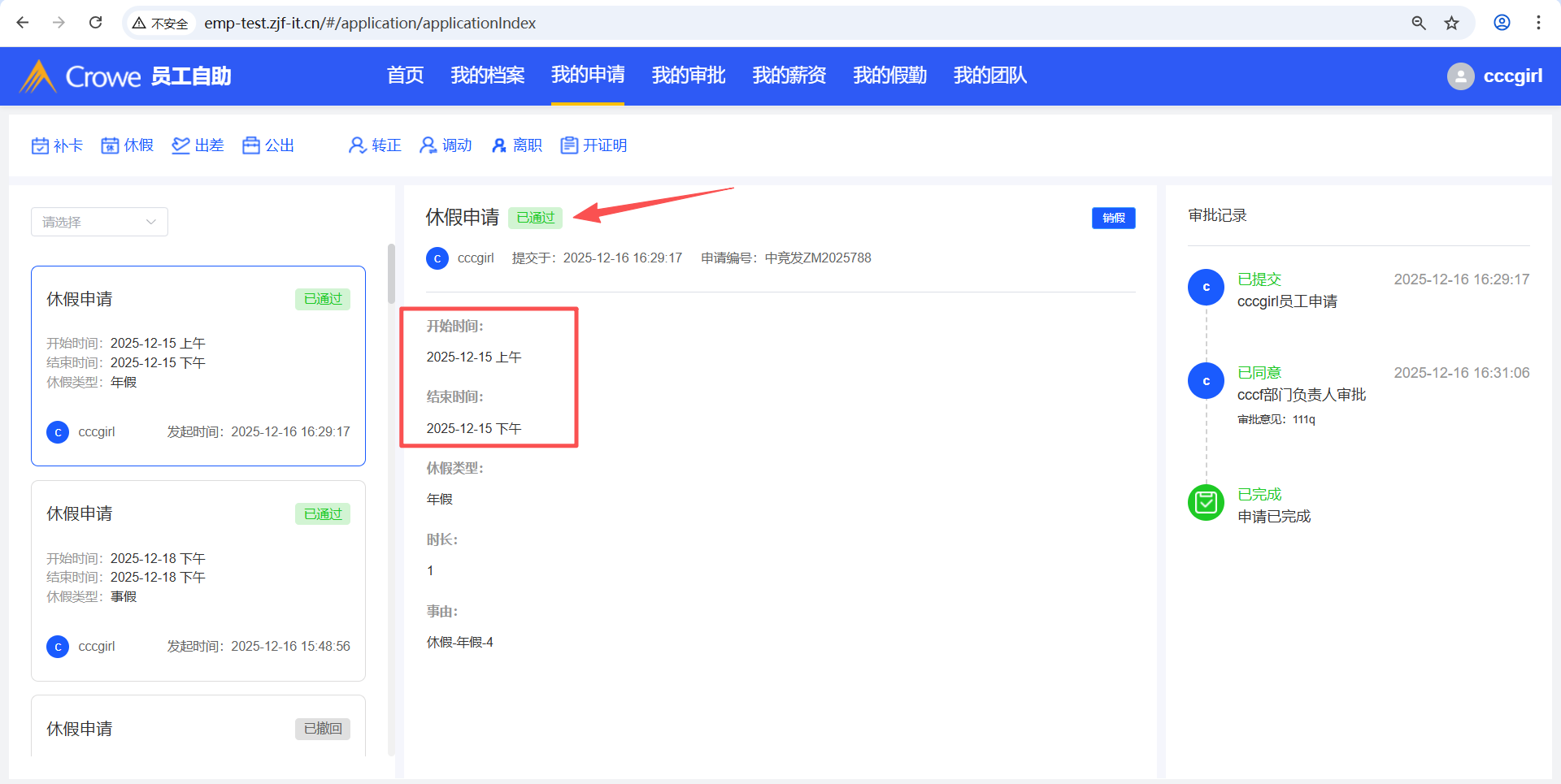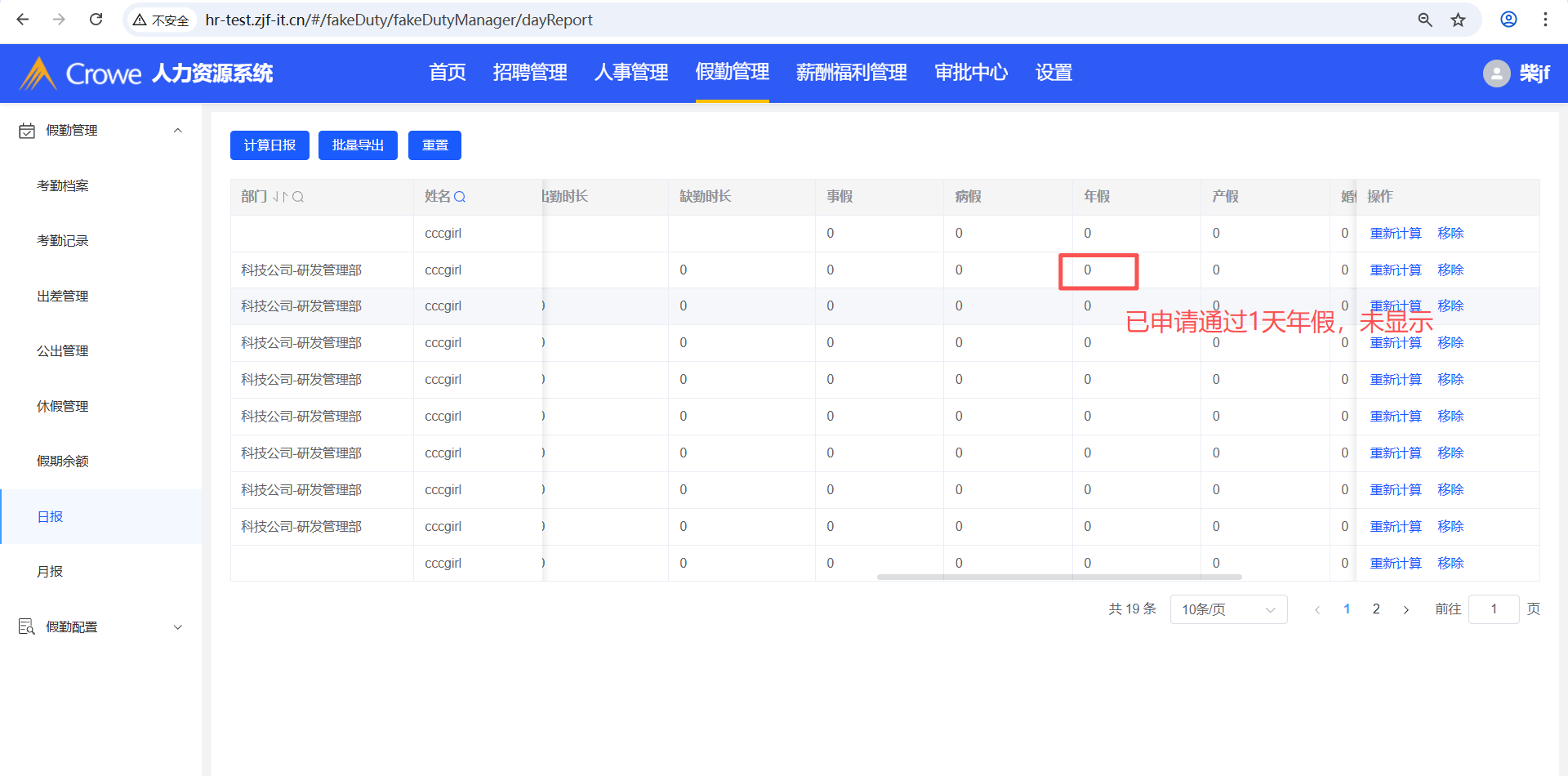 已关闭人力资源系统-假勤管理,在员工自助-我的申请已申请通过1天年假,日报、月报分别计算后,列表字段年假未显示1