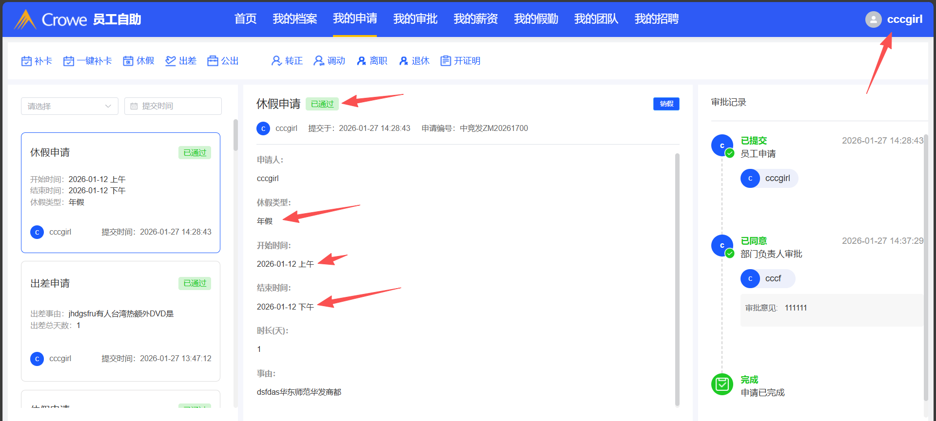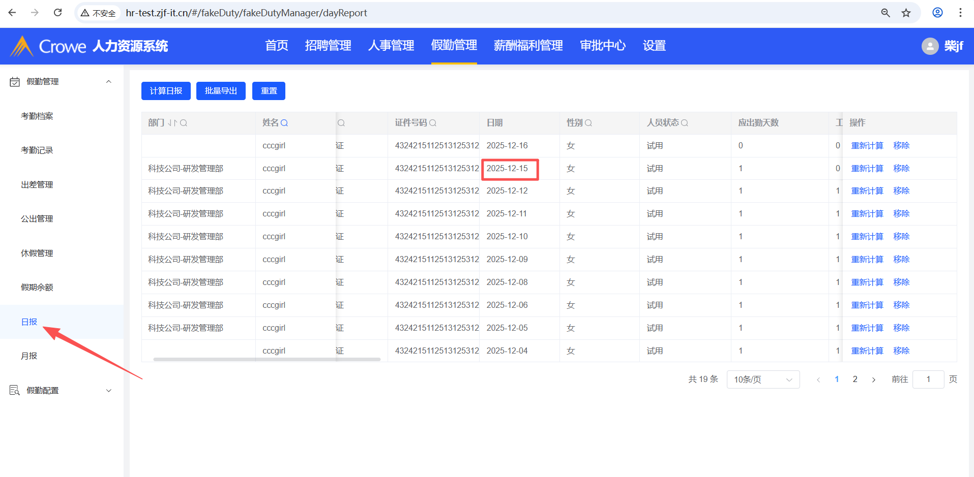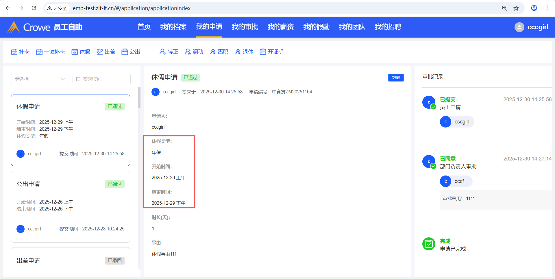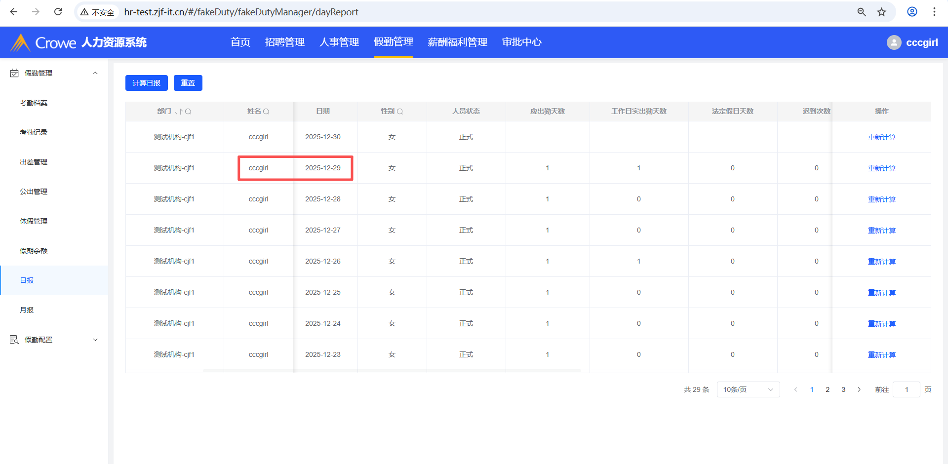 已关闭人力资源系统-假勤管理,在员工自助-我的申请已申请通过1天年假,日报、月报分别计算后,列表字段年假未显示1