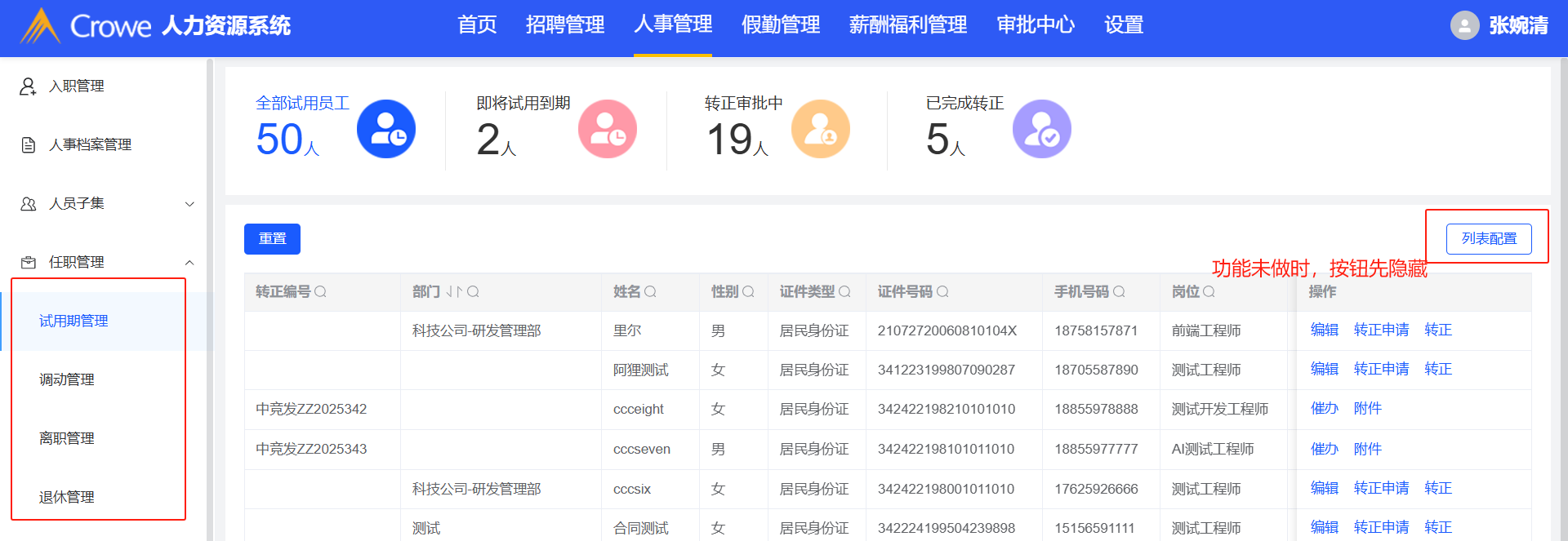 人事管理-任职管理:列表配置功能未做,按钮先隐藏