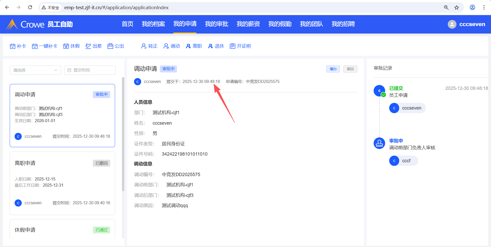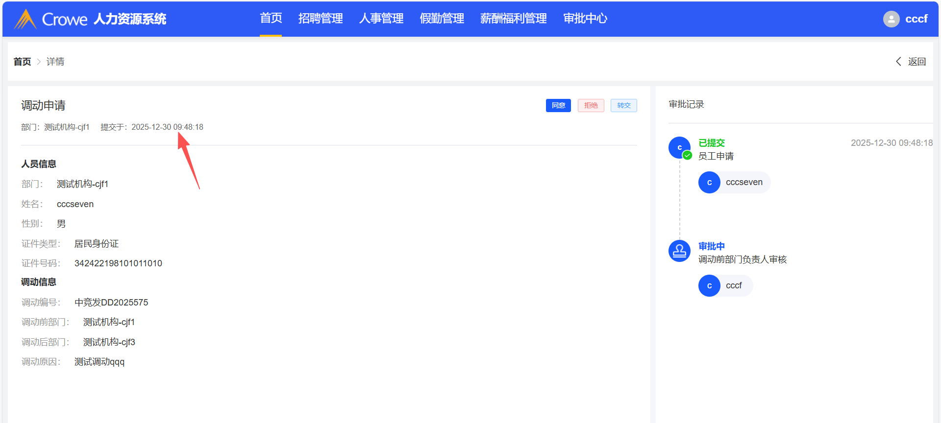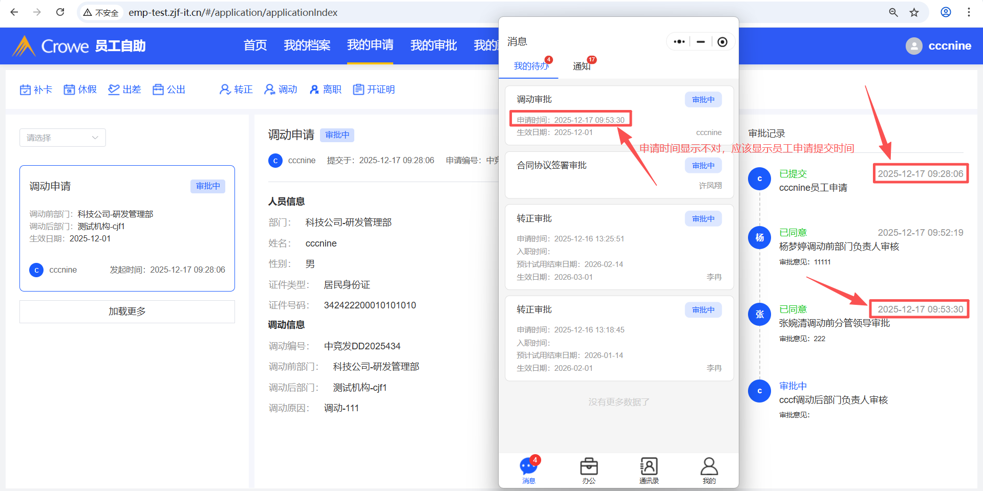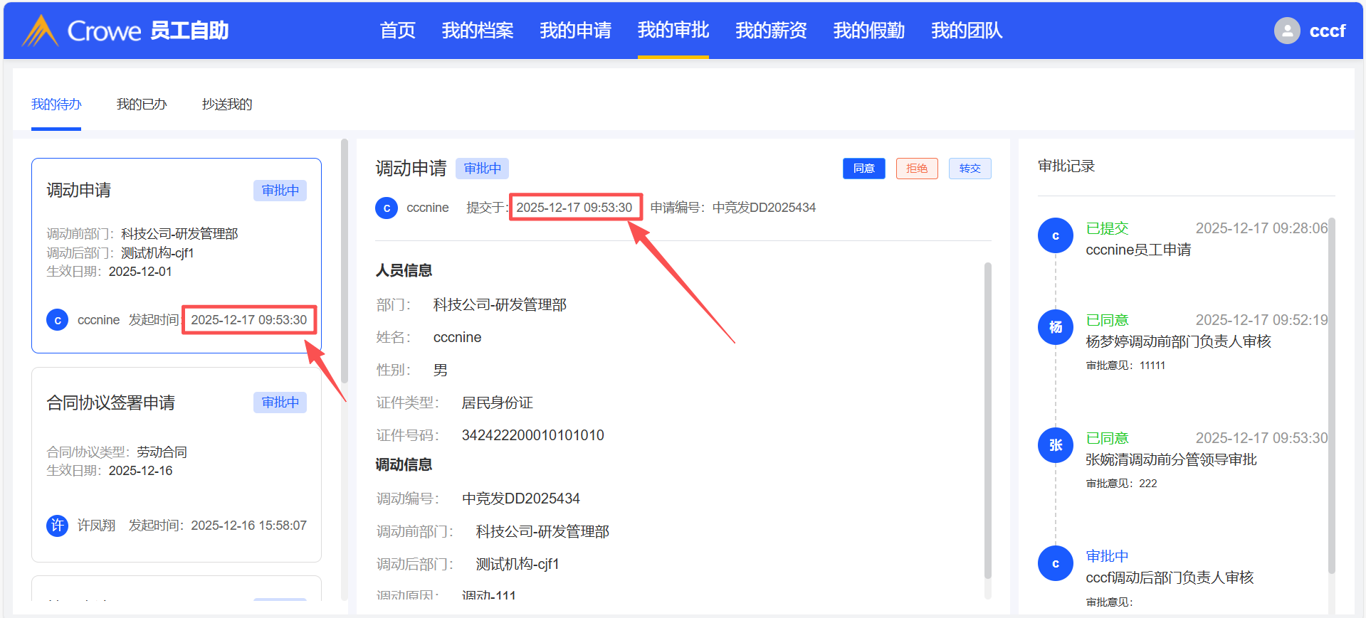 已关闭小程序-消息-我的待办,调动审批的申请时间,应该显示员工申请的提交时间,人力资源系统的首页待办、员工自助的首页待办、我的审批待办 同理