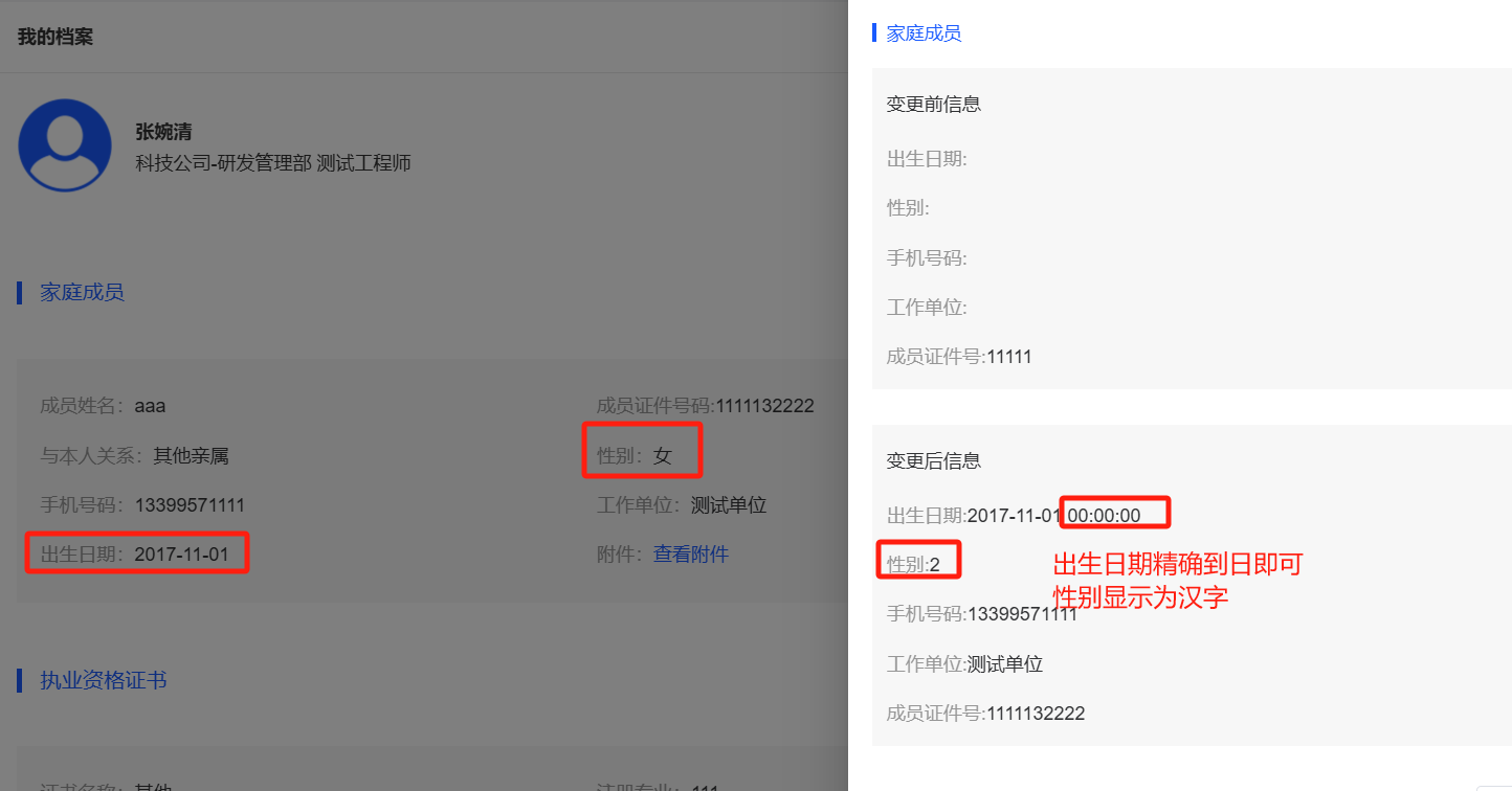 员工自助-我的档案-家庭成员:右侧信息变更记录中查看的出生日期和性别需修改