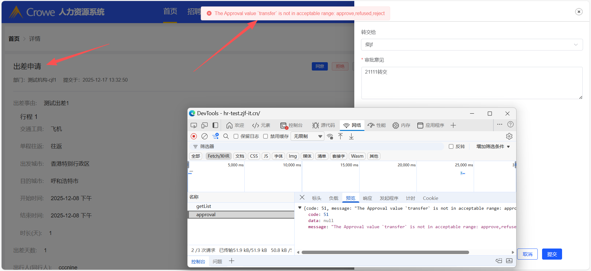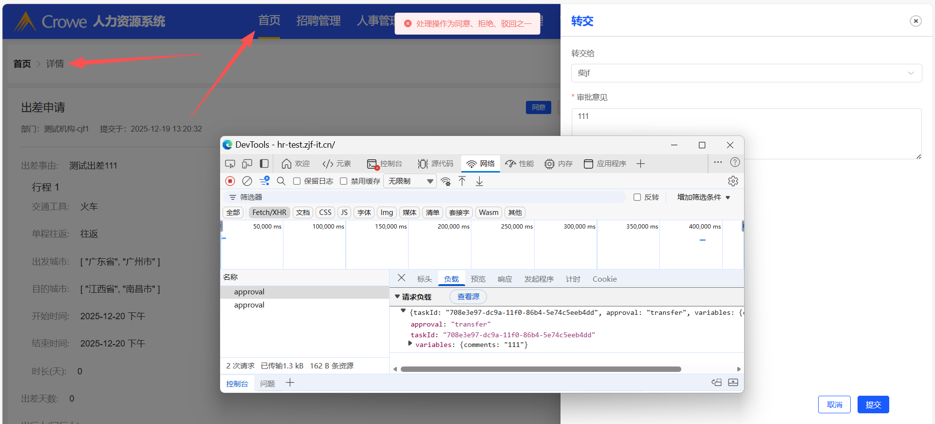 人力资源系统-首页-我的待办,对出差申请进行转交,1、有报错, 2、建议提示语改成中文