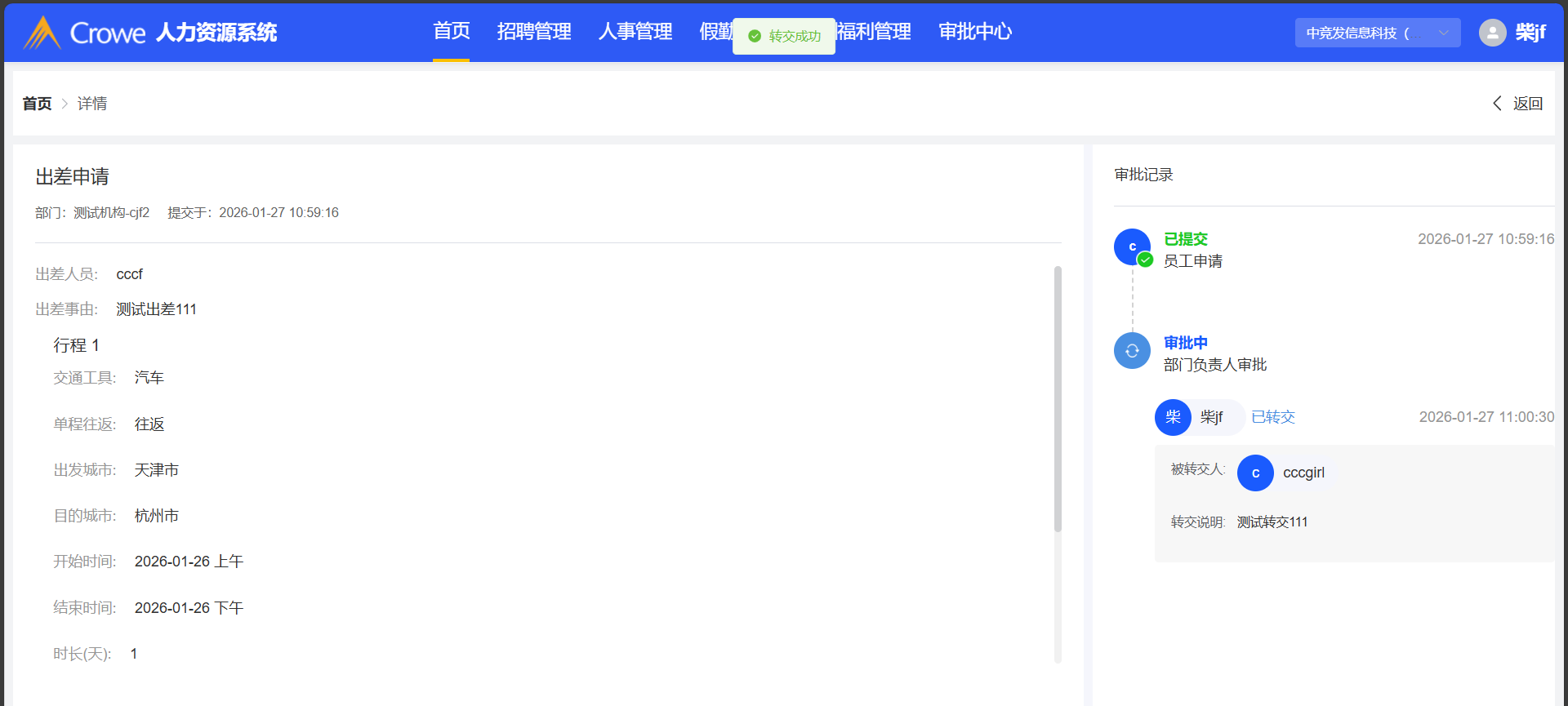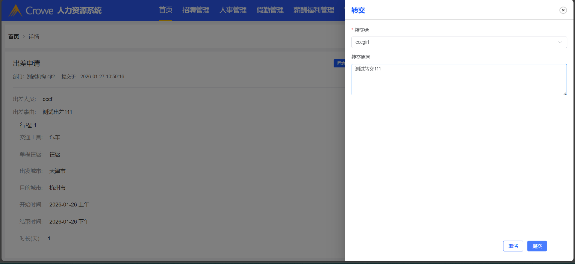 • 复制到 测试 #1469: 人力资源系统-首页-我的待办,对公出申请进行转交,有报错,建议提示语改成中文 已添加