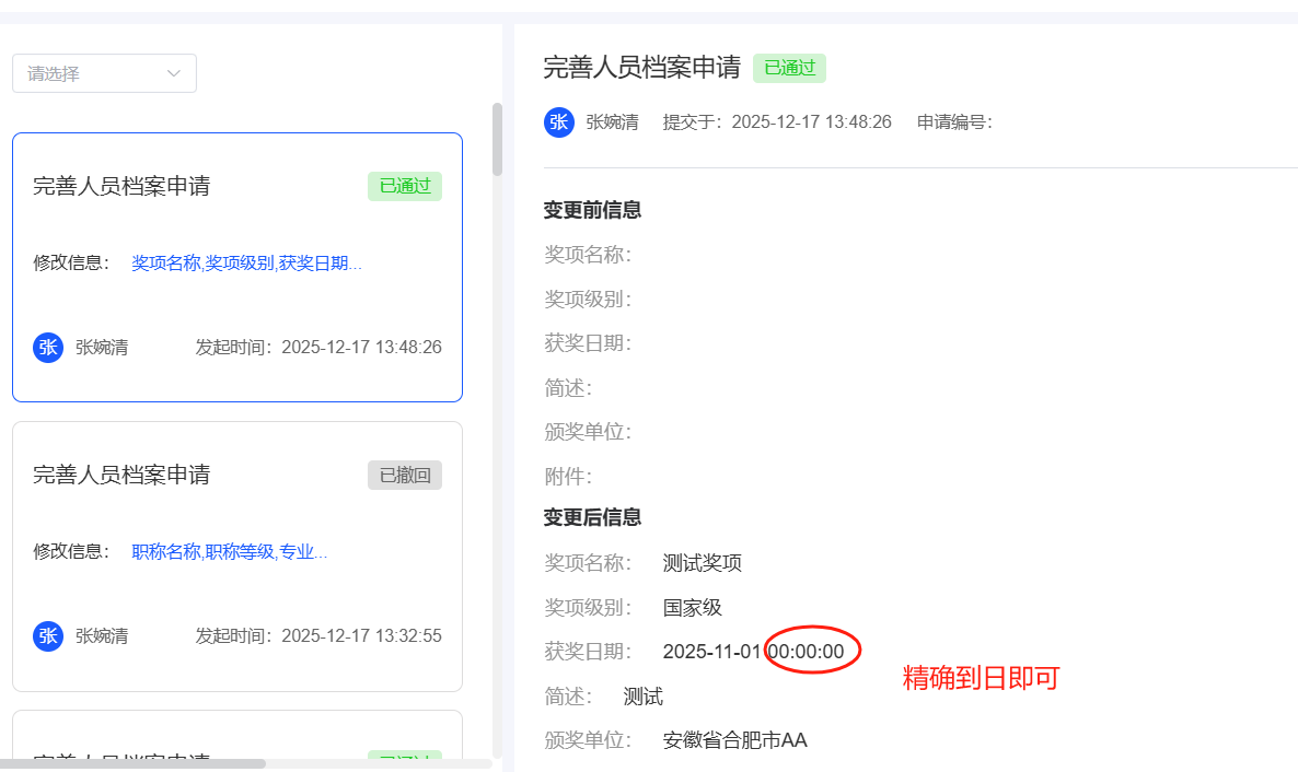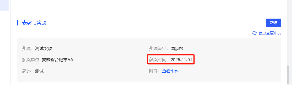 员工自助-我的申请/我的档案-表彰与奖励:查看的获奖日期不用精确到时分秒