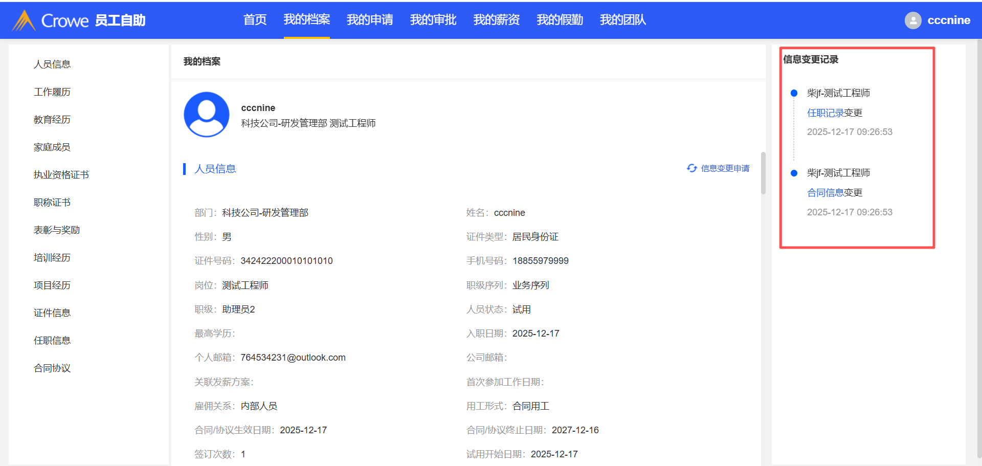 人力资源系统-人事管理-入职管理,新增入职员工A,然后A登录员工自助-我的档案,不需要显示信息变更记录