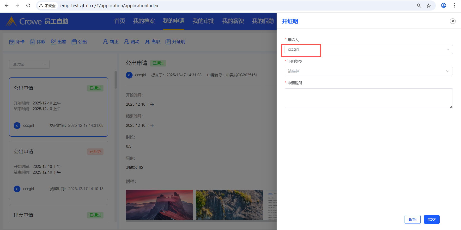 员工自助-我的申请-开证明,点击开证明,申请人字段不可修改时,建议置灰