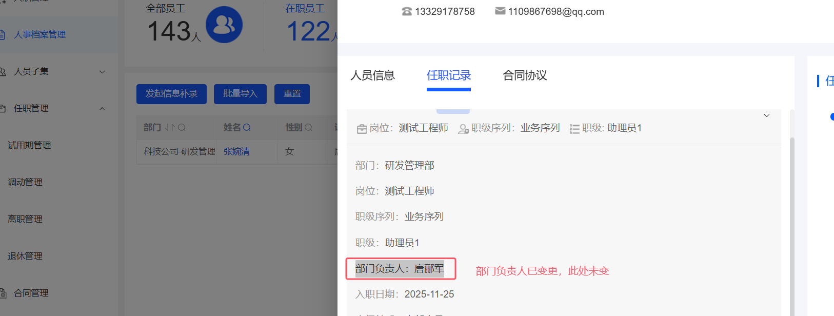 人事管理-人事档案管理:部门负责人已变更,任职记录中仍是未变更前负责人