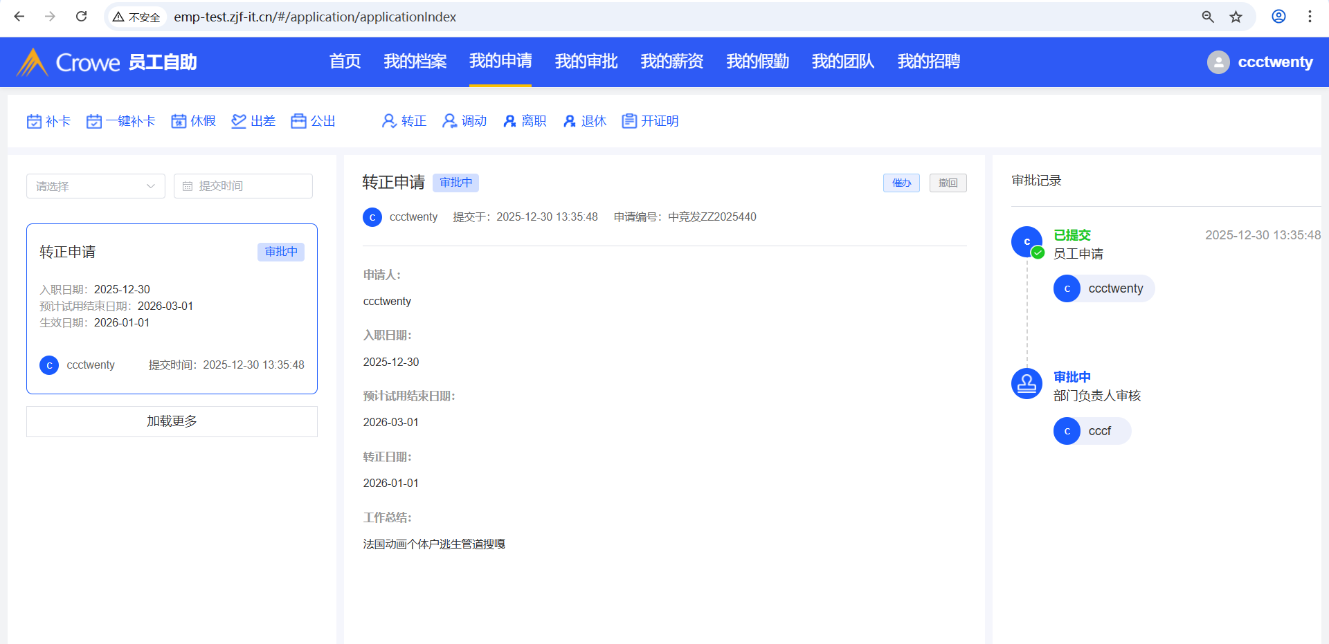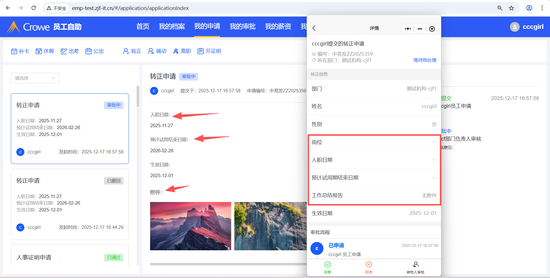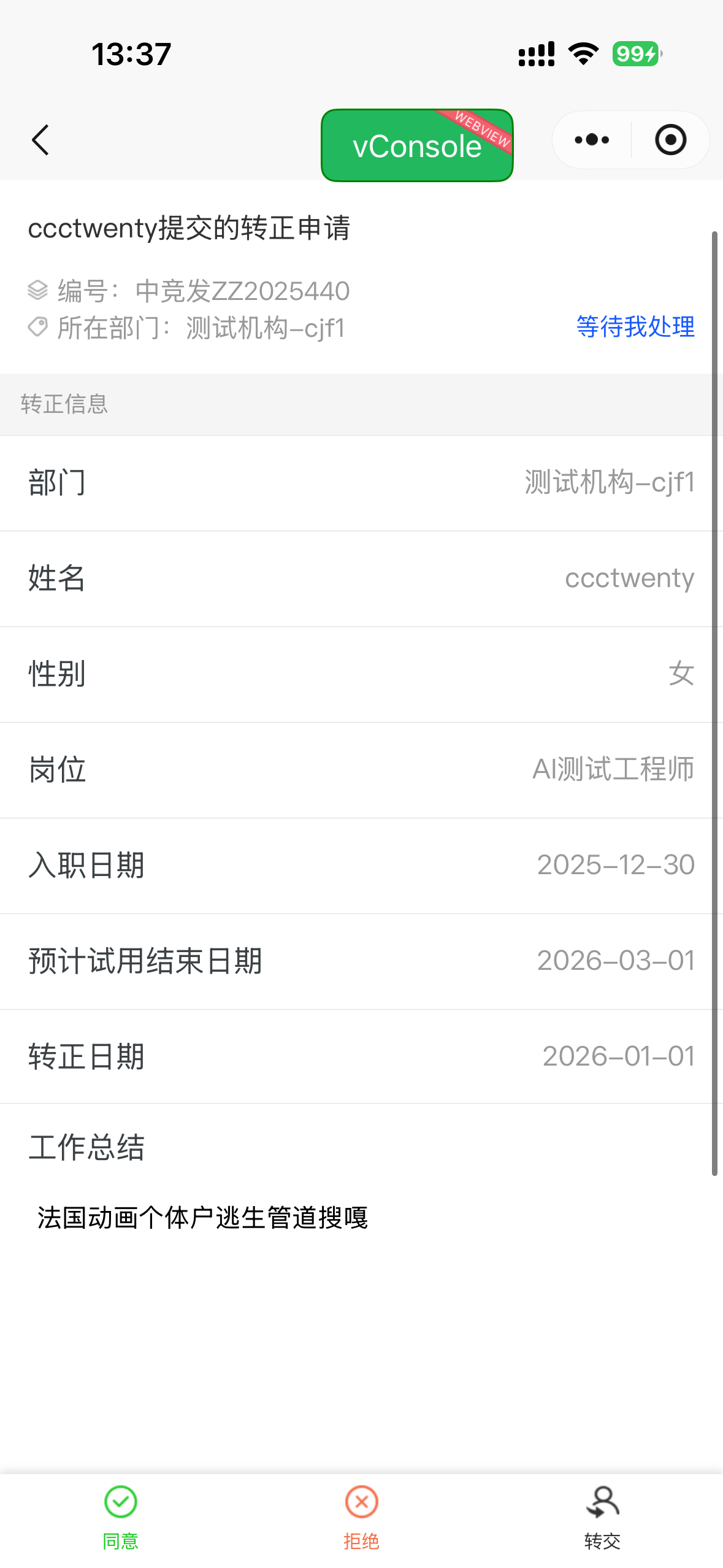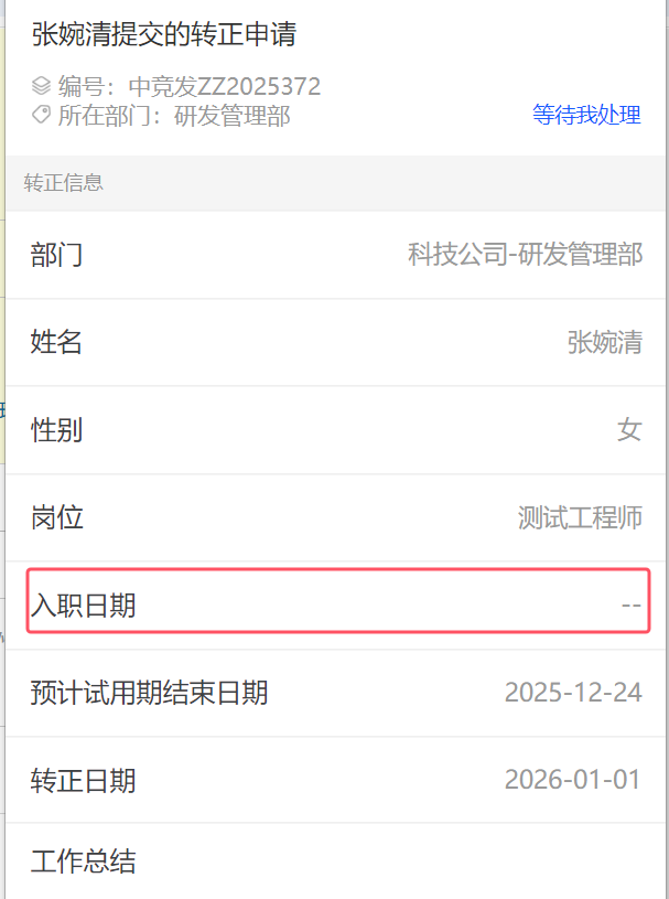 已关闭员工自助-我的申请-转正申请后,审核人的小程序-消息-我的待办-转正审批详情里,岗位、入职日期、预计试用期结束日期、工作总结报告都未显示