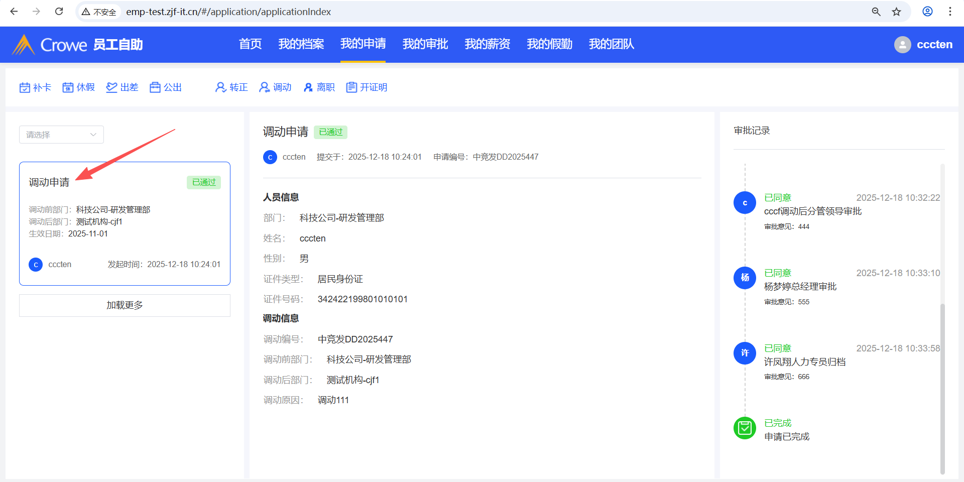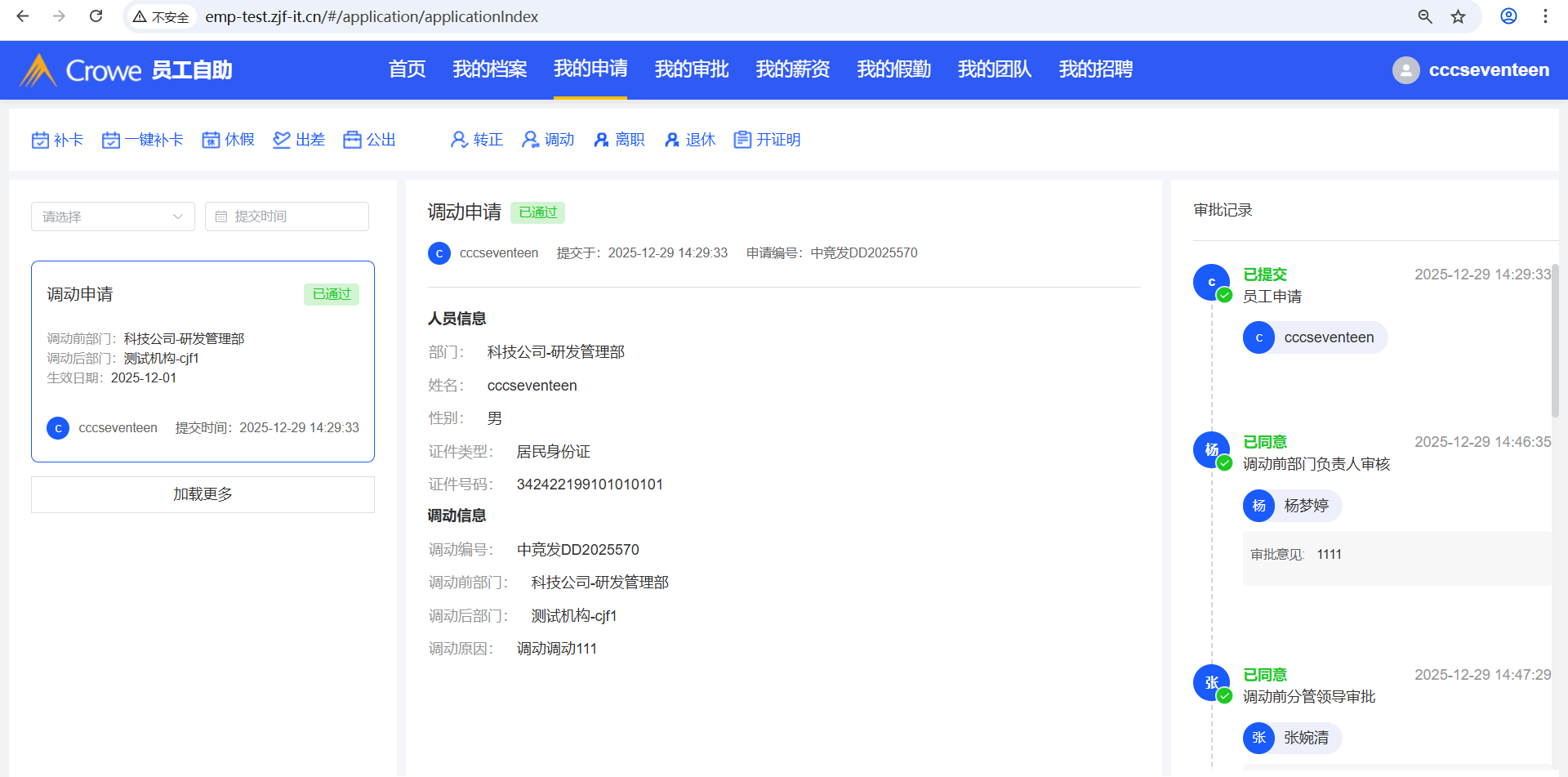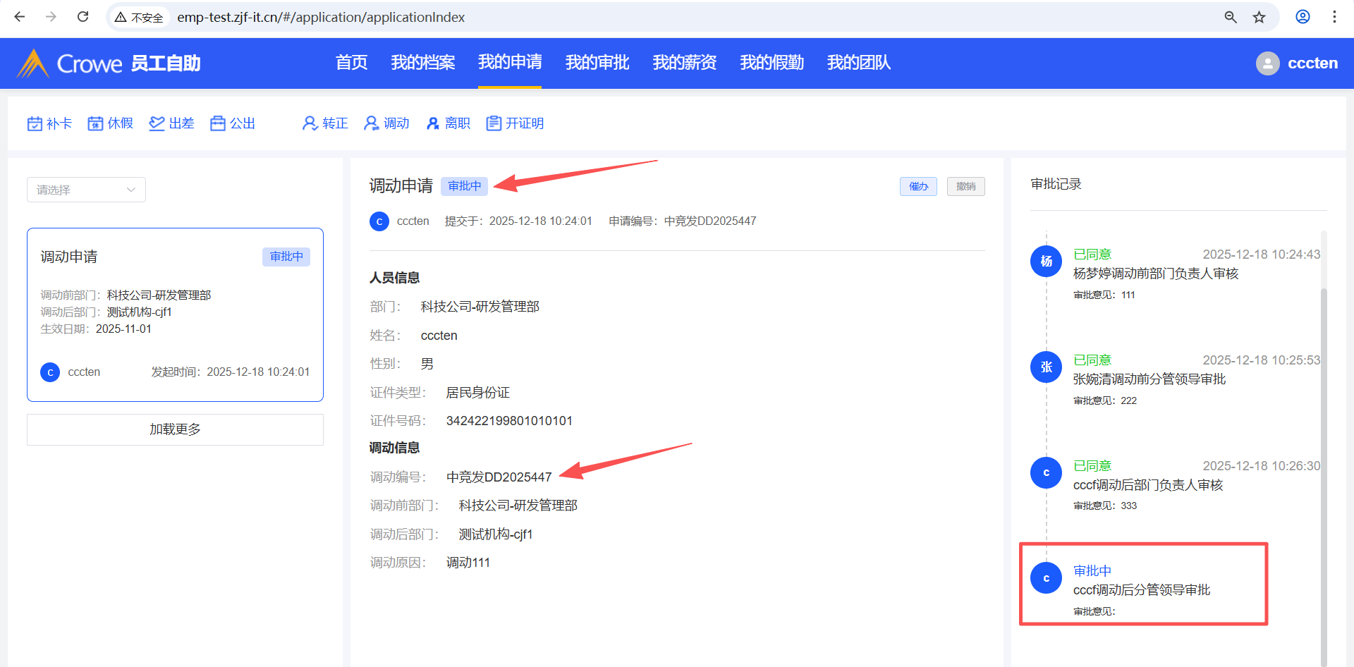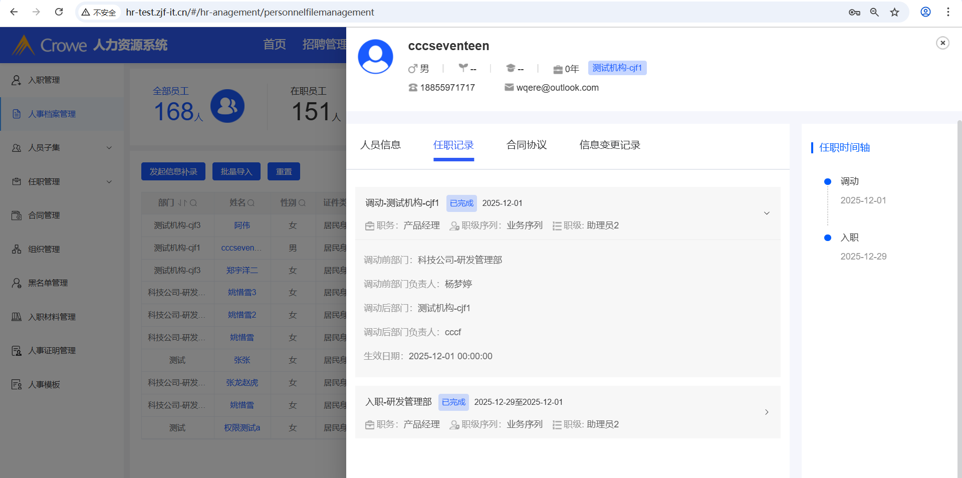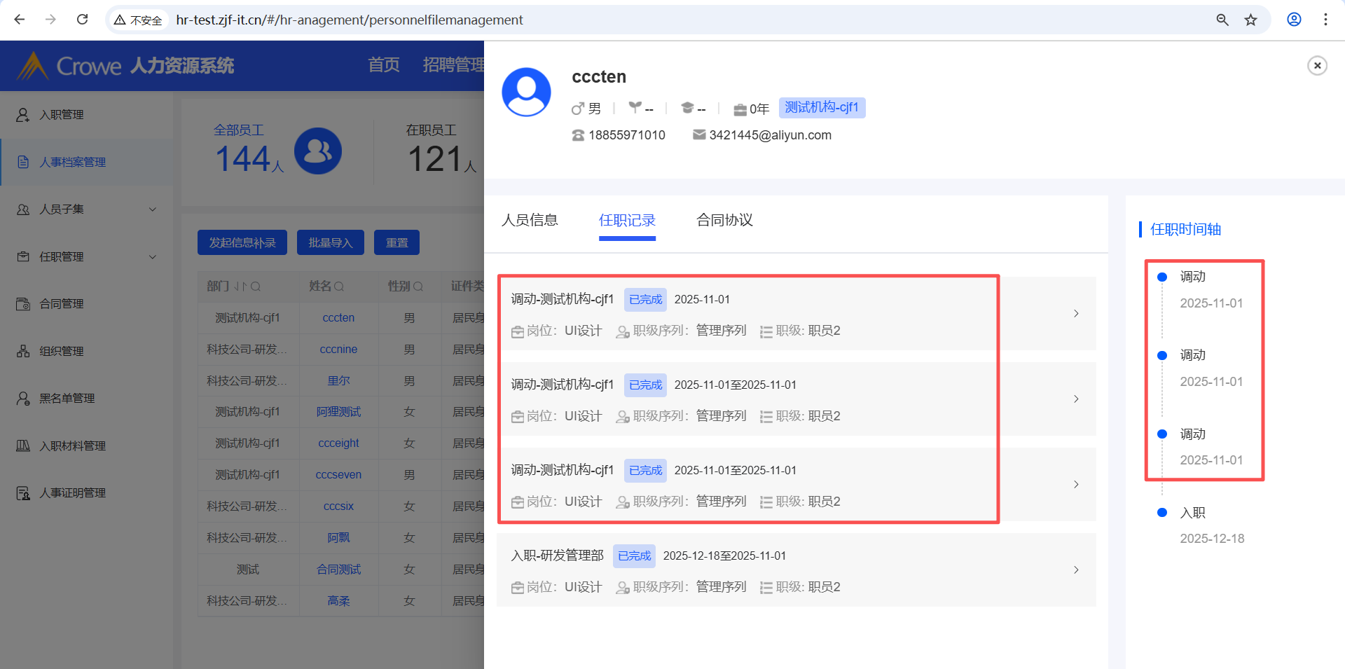 已关闭员工自助-我的申请-调动,申请调动一次并且审批通过(审批流程中第一个审核人转交),在人力资源系统-人事管理-人事档案管理-任职记录里,显示了3条相同的任职记录、任职时间轴