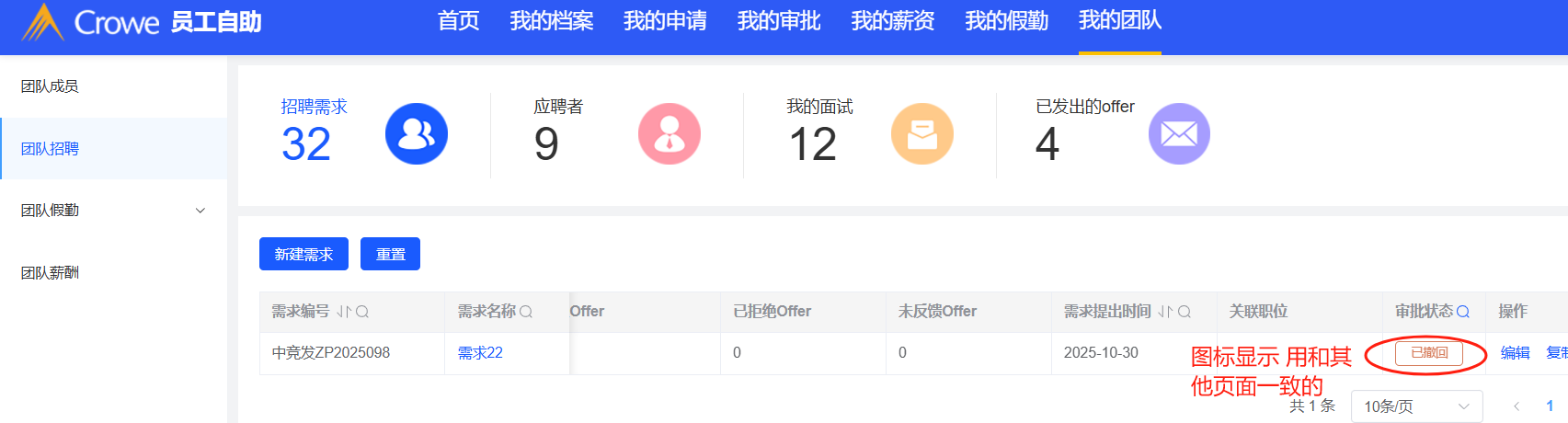 员工自助-我的团队-团队招聘:已撤回的图标样式修改,与系统其他页面保持一致