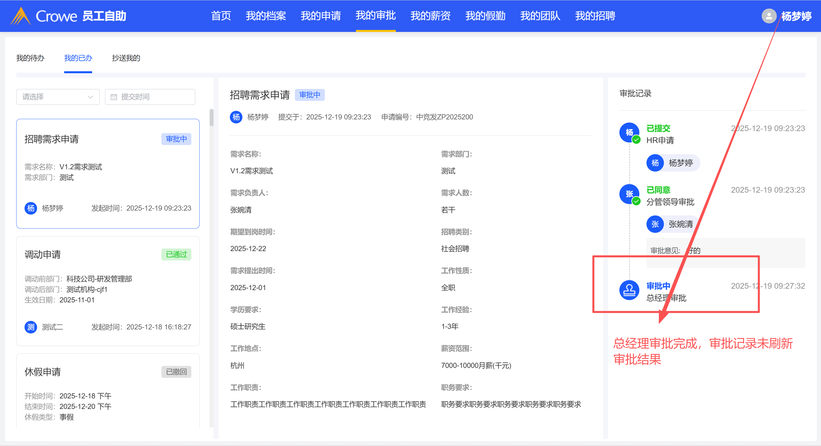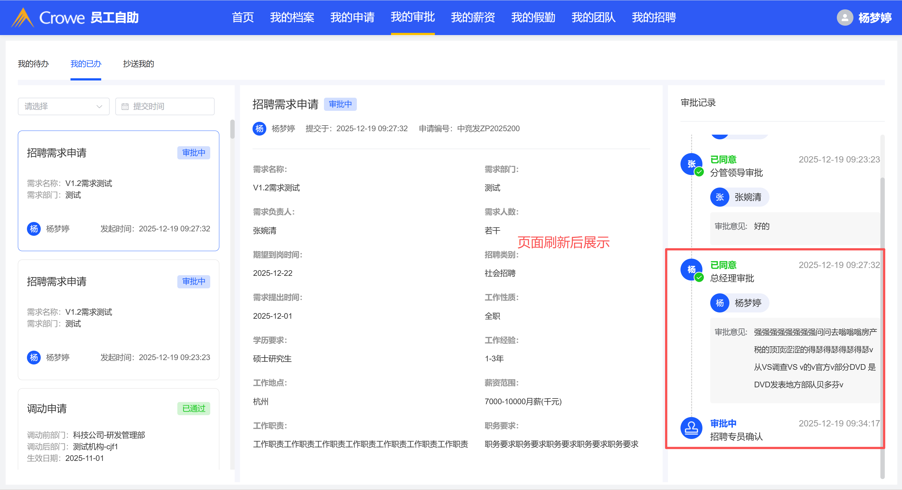 审批完成后,我的已办列表未刷新审批记录内容,需要刷新网页