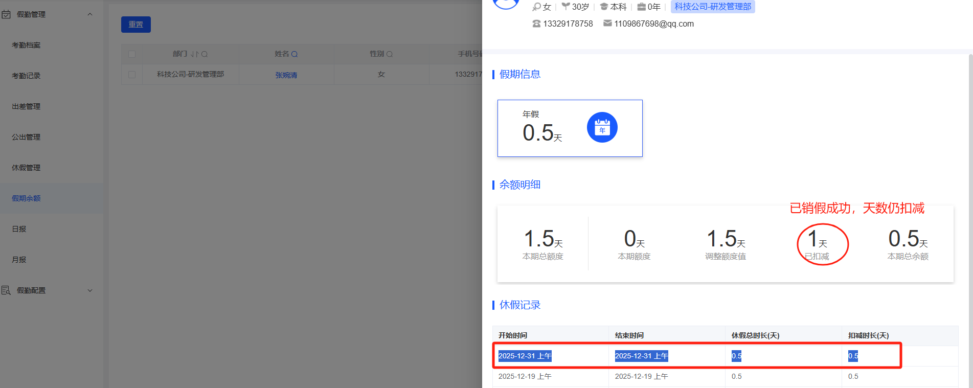 假勤管理-假期余额:已销假成功,仍扣减天数