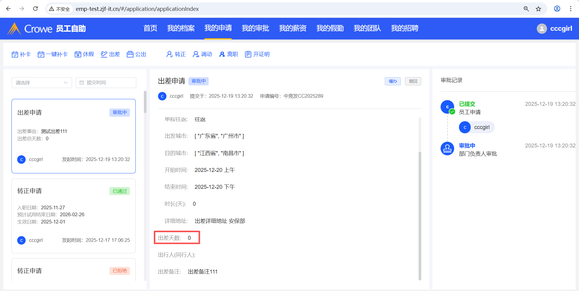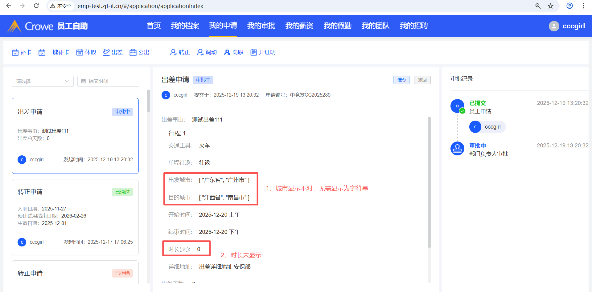 已关闭员工自助-我的申请-出差,出差申请,1、出发城市、目的城市无需显示字符串 2、时长不应为0 3、出差天数不应为0