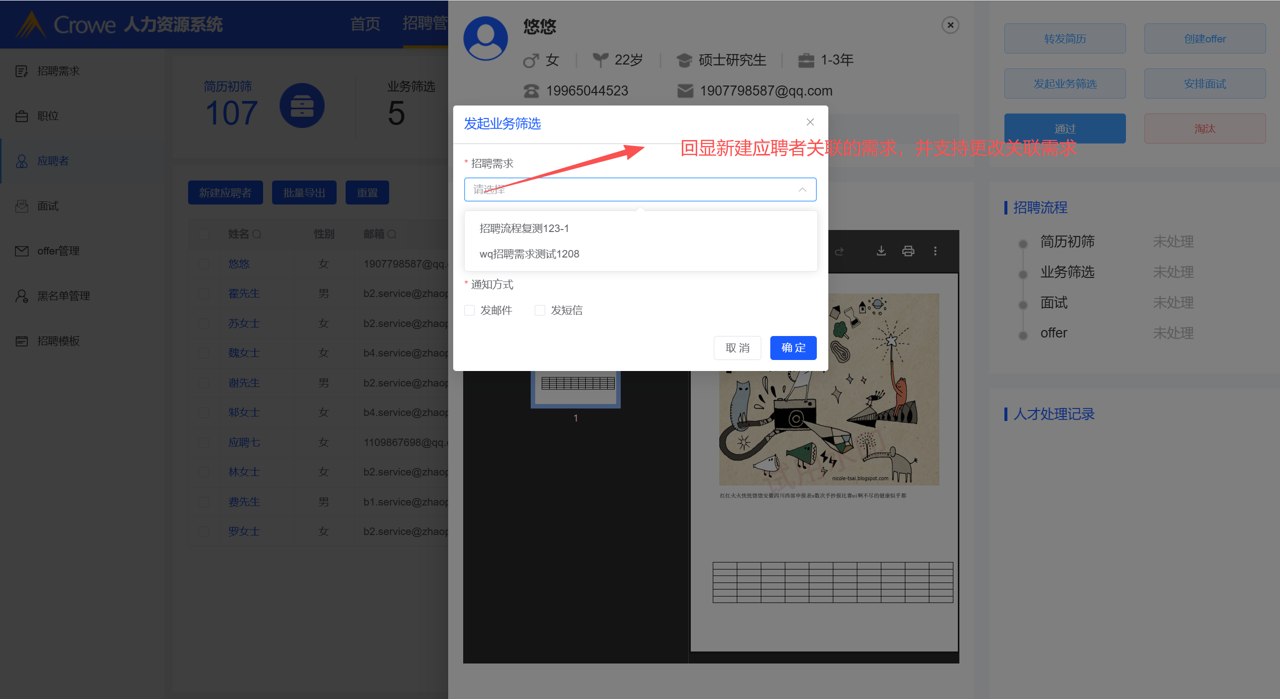 发起业务筛选操作-招聘需求回显新建应聘者关联的需求,并支持更换需求