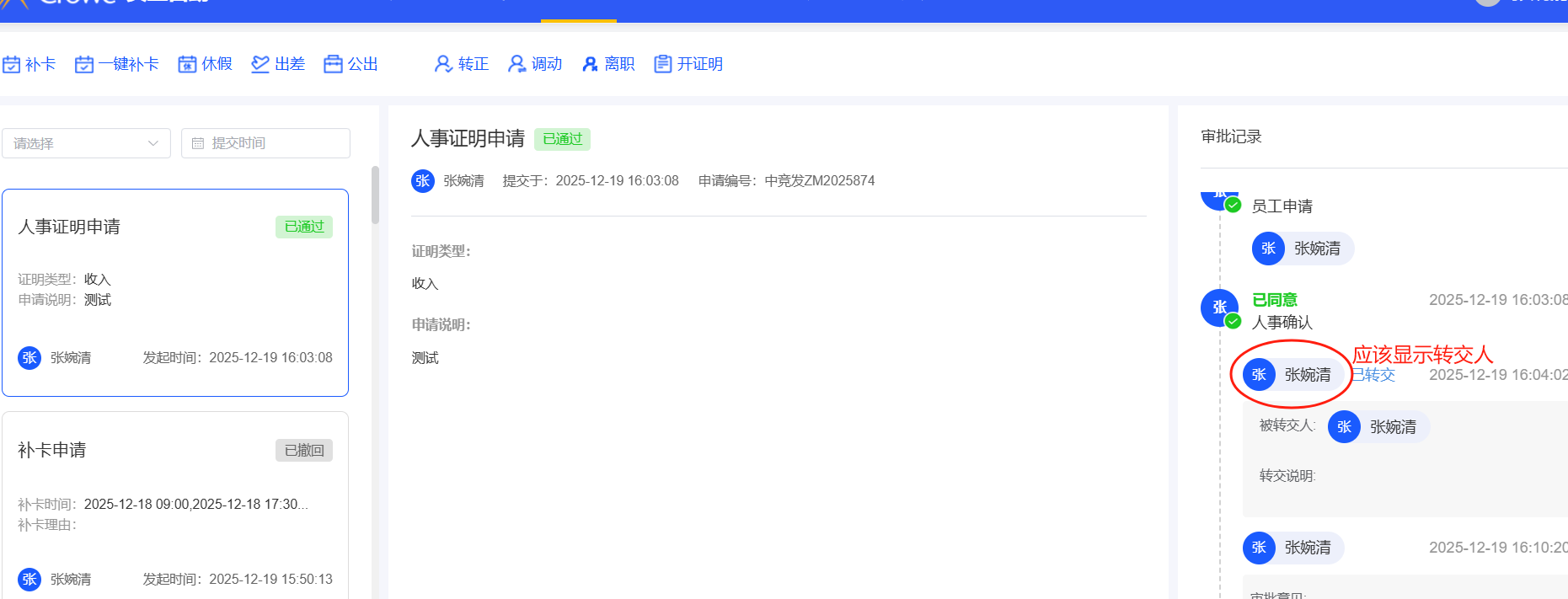 员工自助-我的申请:转交中的转交人显示错误,显示的是被转交人