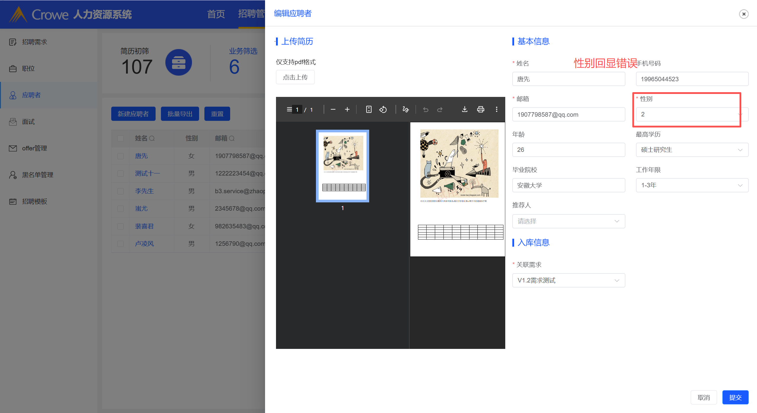 编辑应聘者页面,性别回显错误