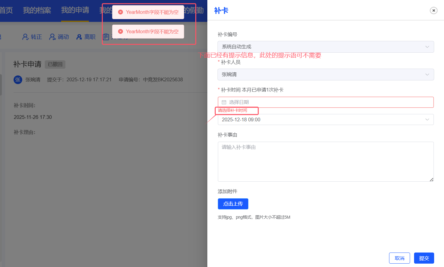 员工自助-我的申请-补卡:补卡日期删除后的提示语修改