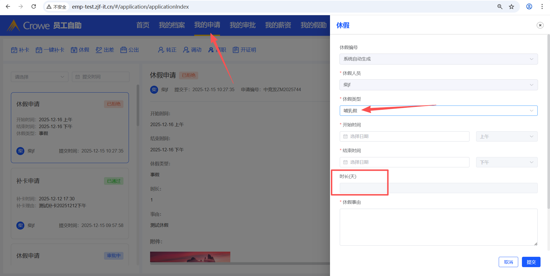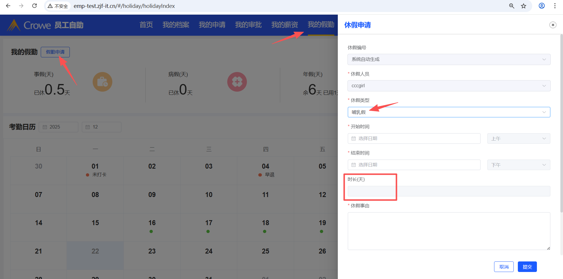 已关闭员工自助-我的申请-休假&我的假勤-假勤申请,选择哺乳假时,需每天时长(小时)1小时,自动显示