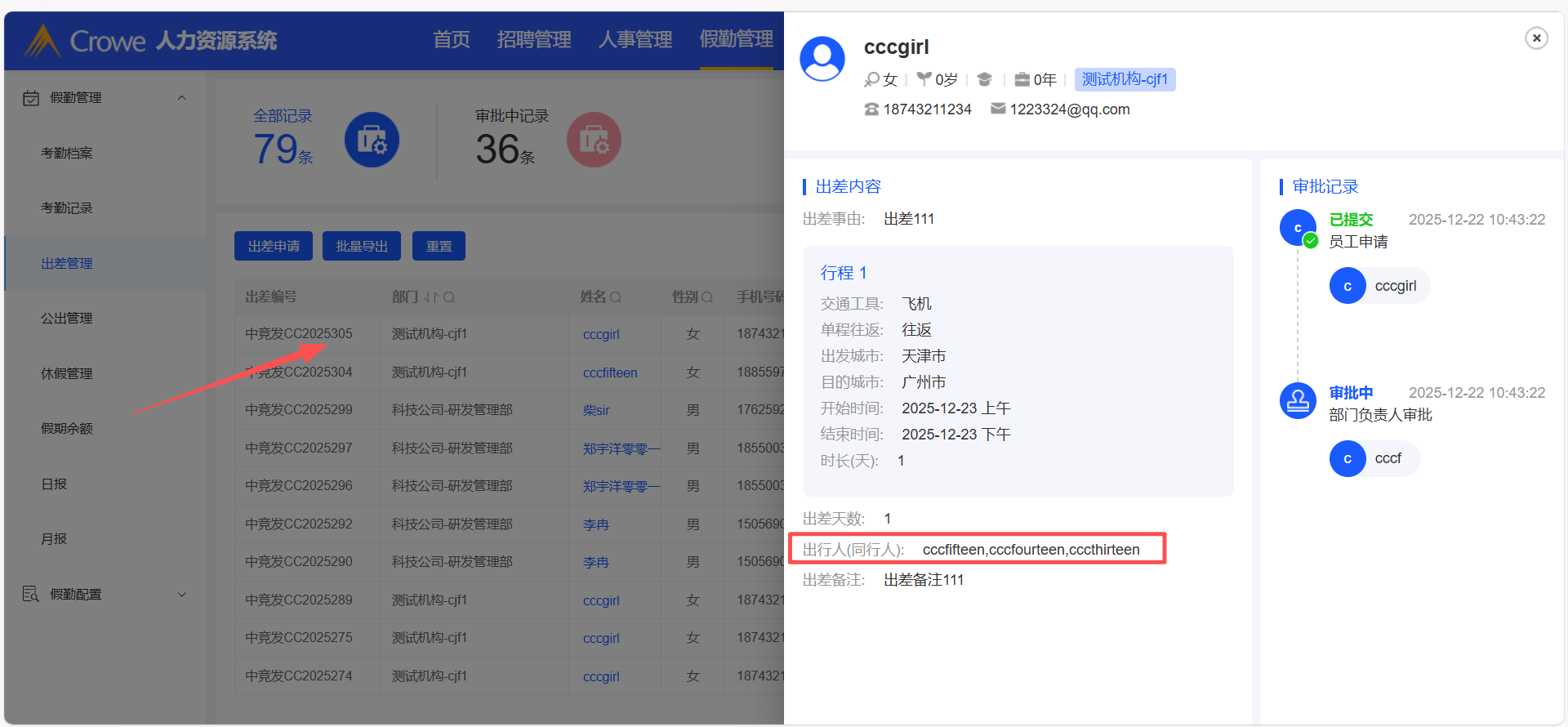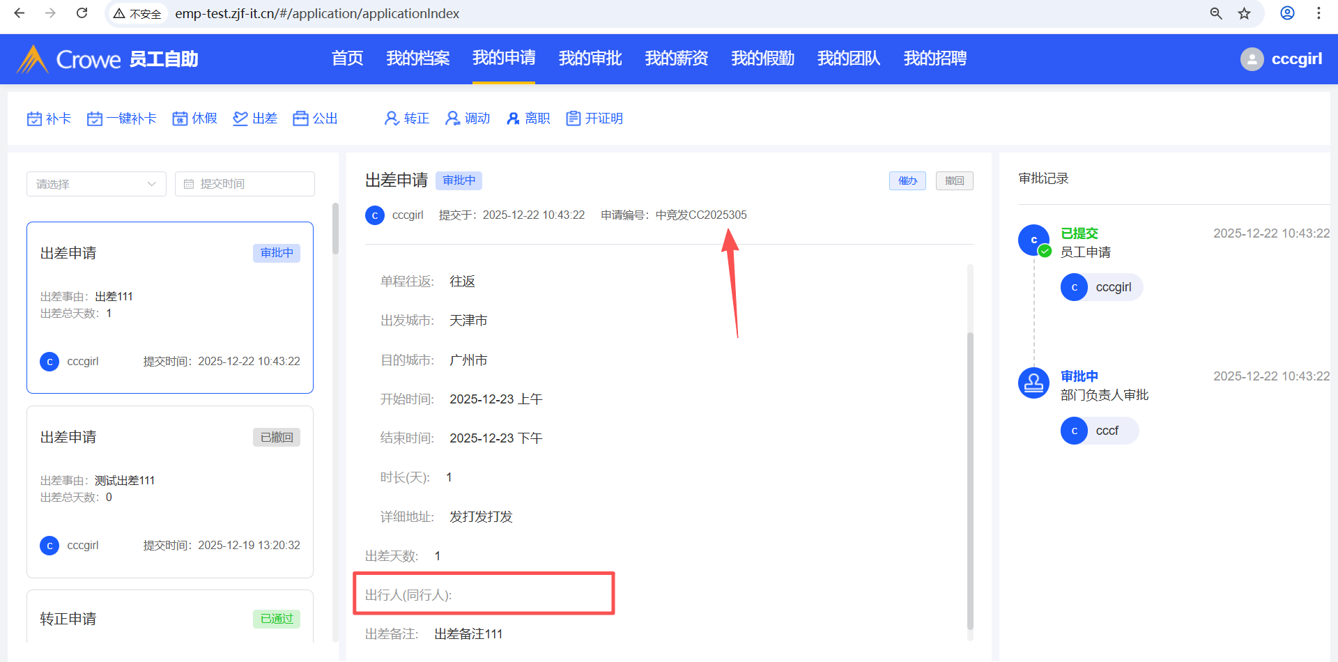 员工自助-我的申请-出差,出差申请填写的同行人,未显示