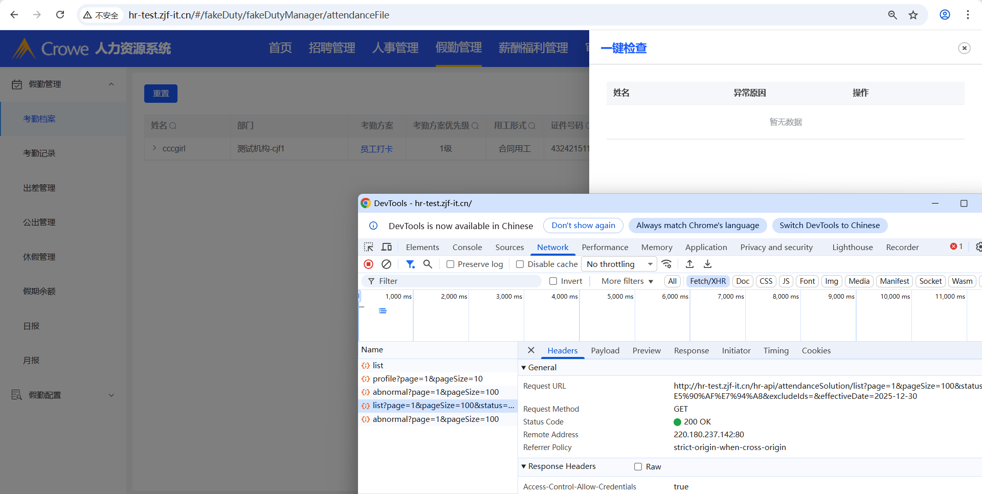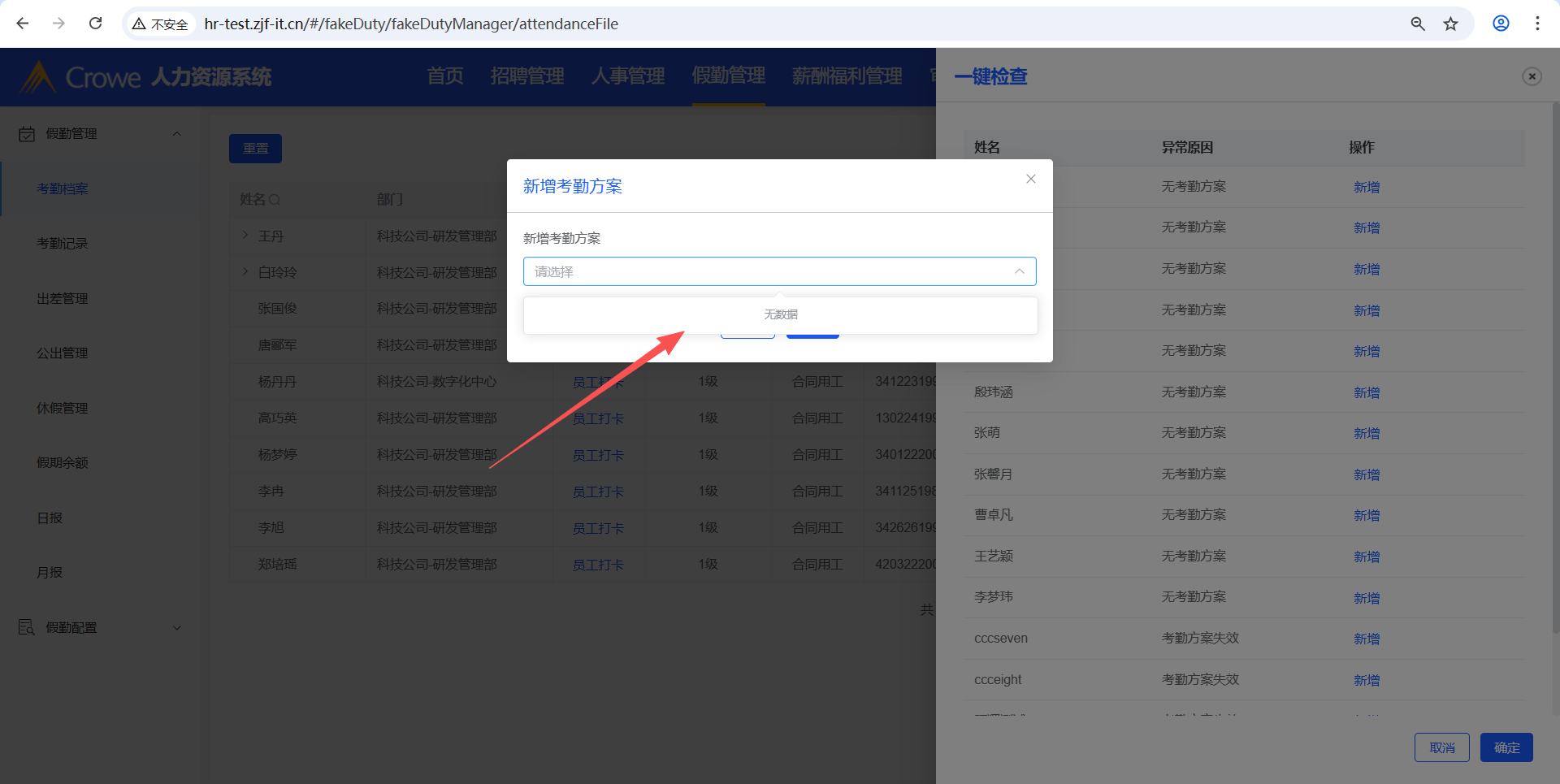 从表头其他菜单点击假勤管理(如:从首页切换到假勤管理),点击一键检查,点击新增,下拉框无数据,未调用/attendanceSolution/list接口