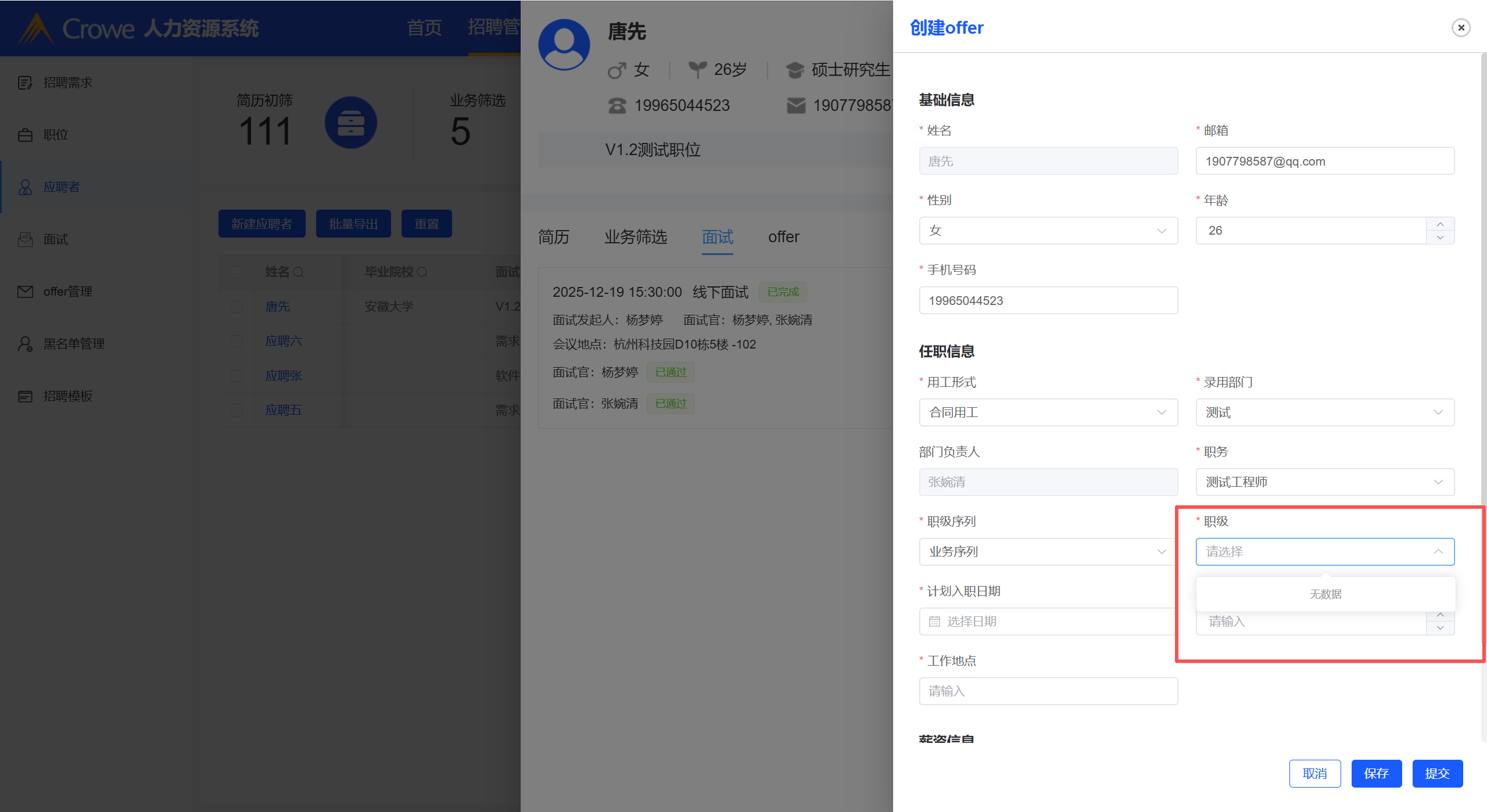 应聘者详情也点击创建offer按钮,职级获取不到对应的数据