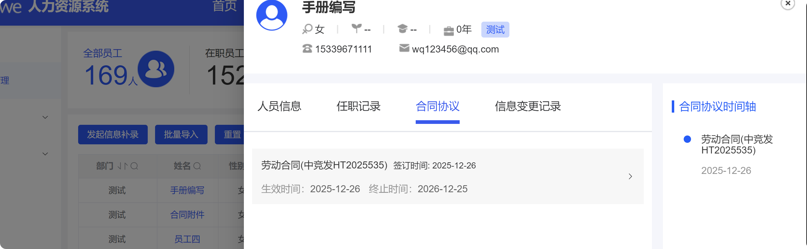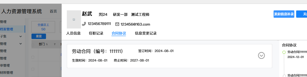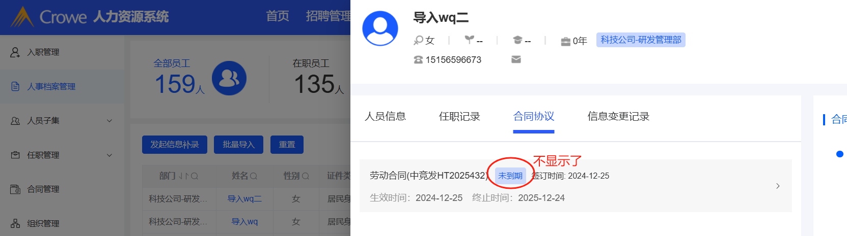 人事管理-人事档案管理:点击姓名查看合同协议,合同协议后的状态不显示