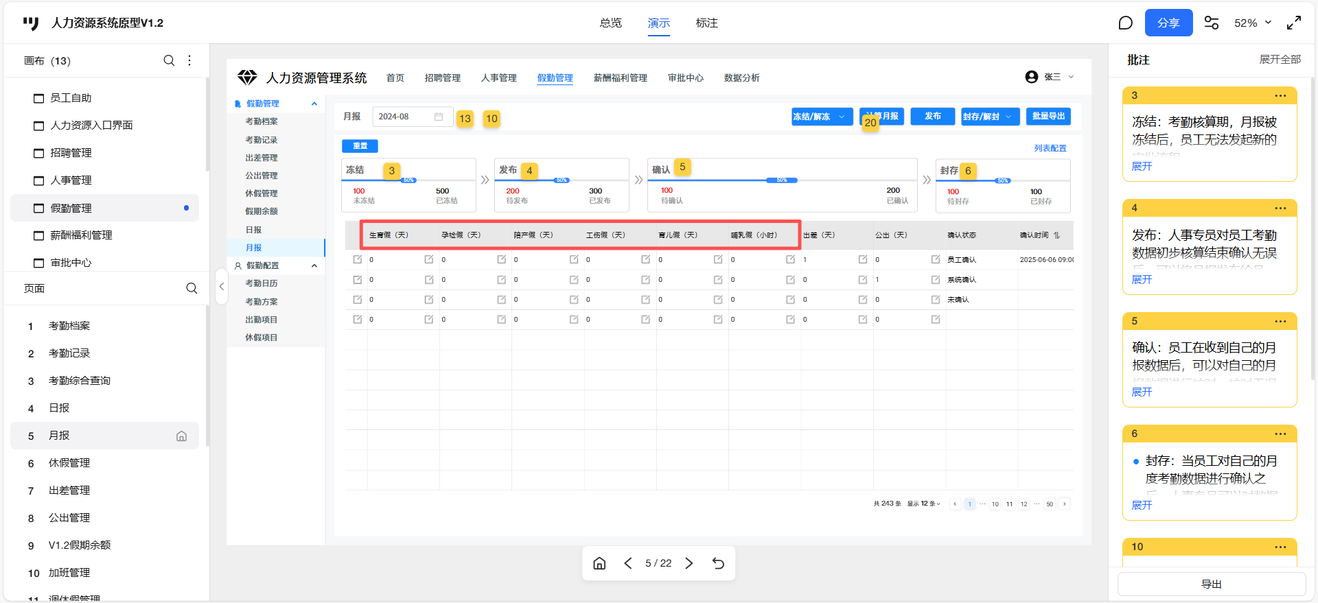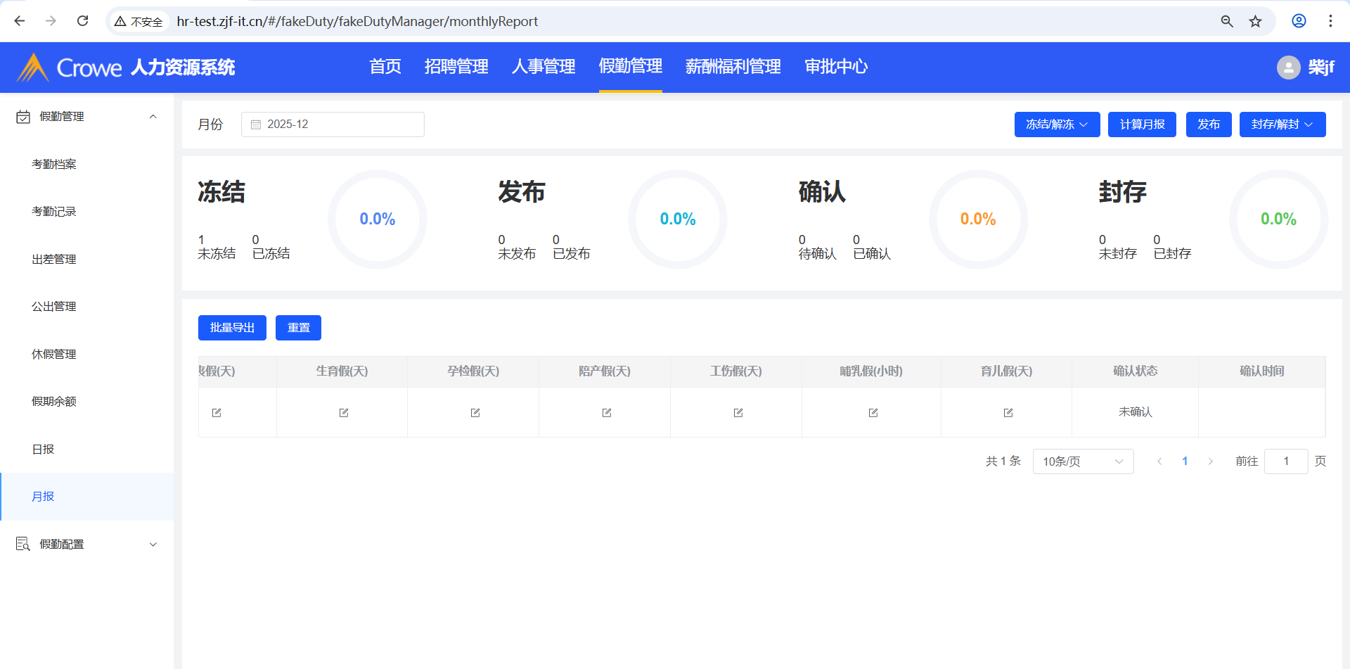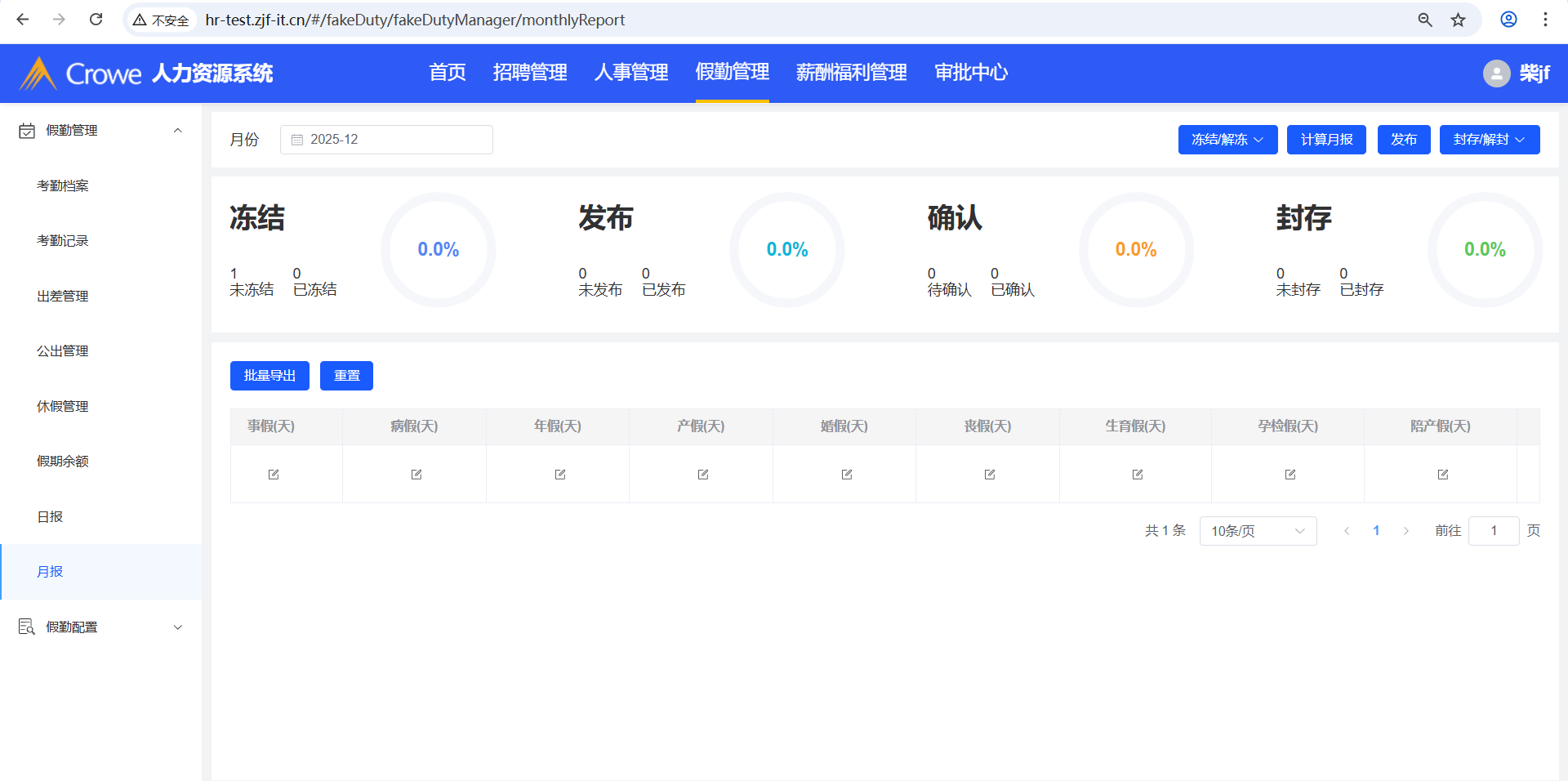 人力资源系统-假勤管理-月报,列表字段,参考原型V1.2版本,需带单位
