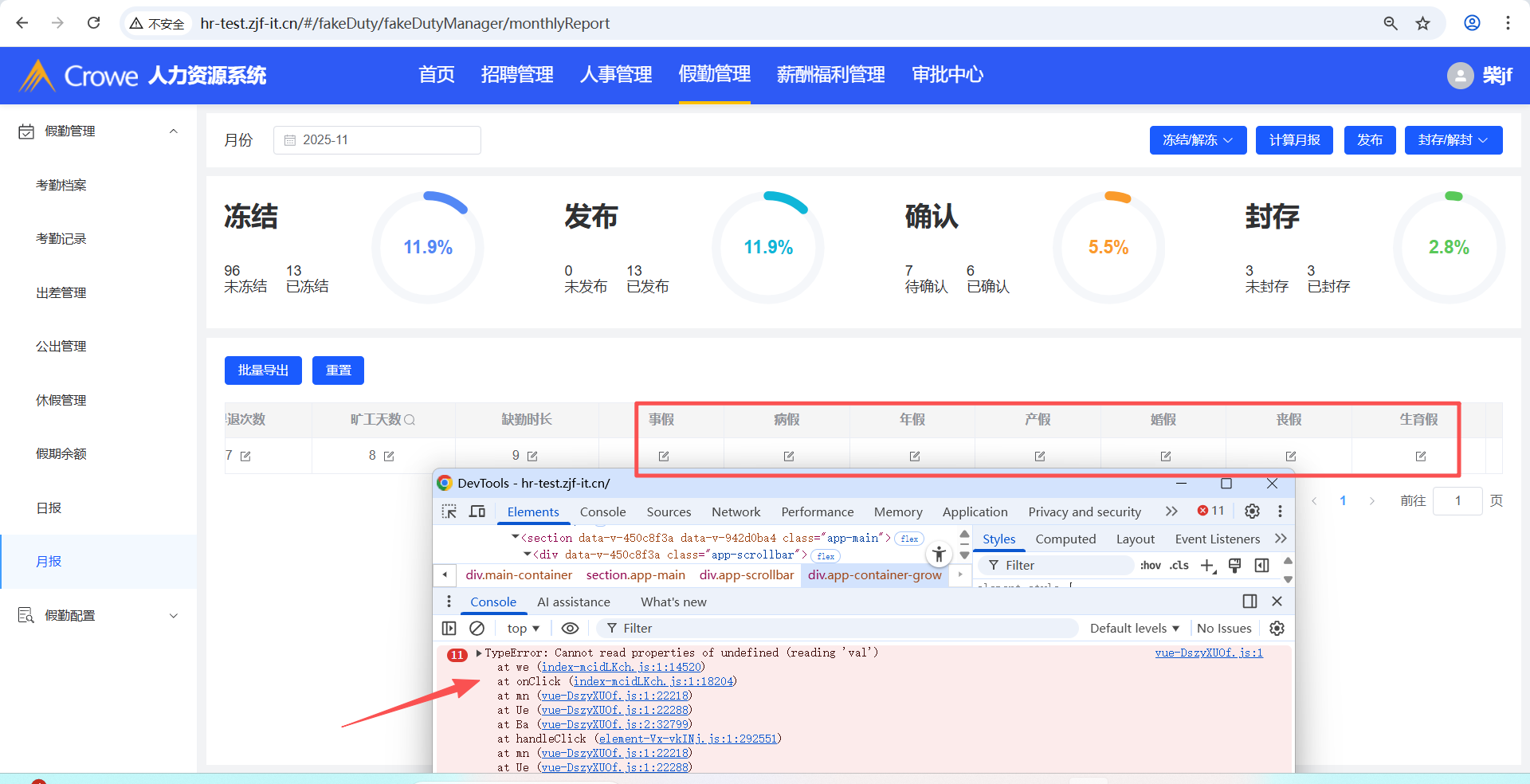 人力资源系统-假勤管理,月报列表,事假及之后的列,点击编辑前端报错,无法编辑
