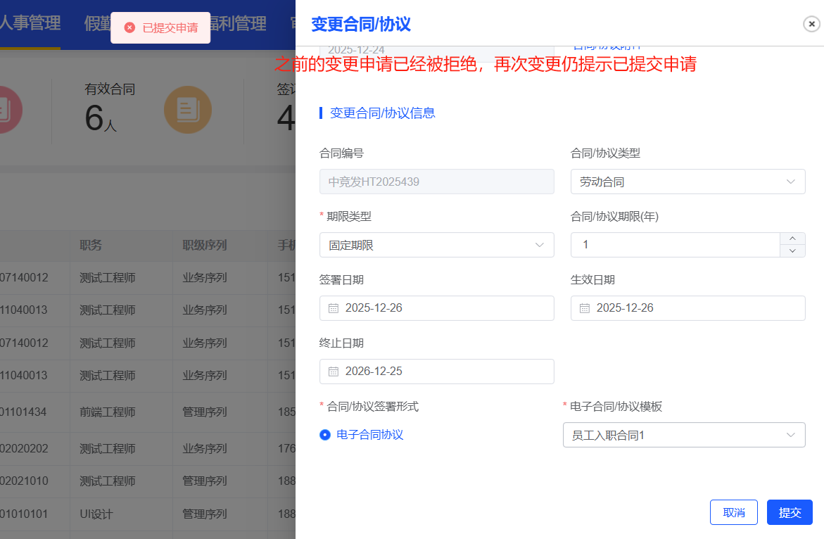 人事管理-合同管理:变更合同协议,之前的变更协议已经被拒绝,再次发起变更,提示已提交申请