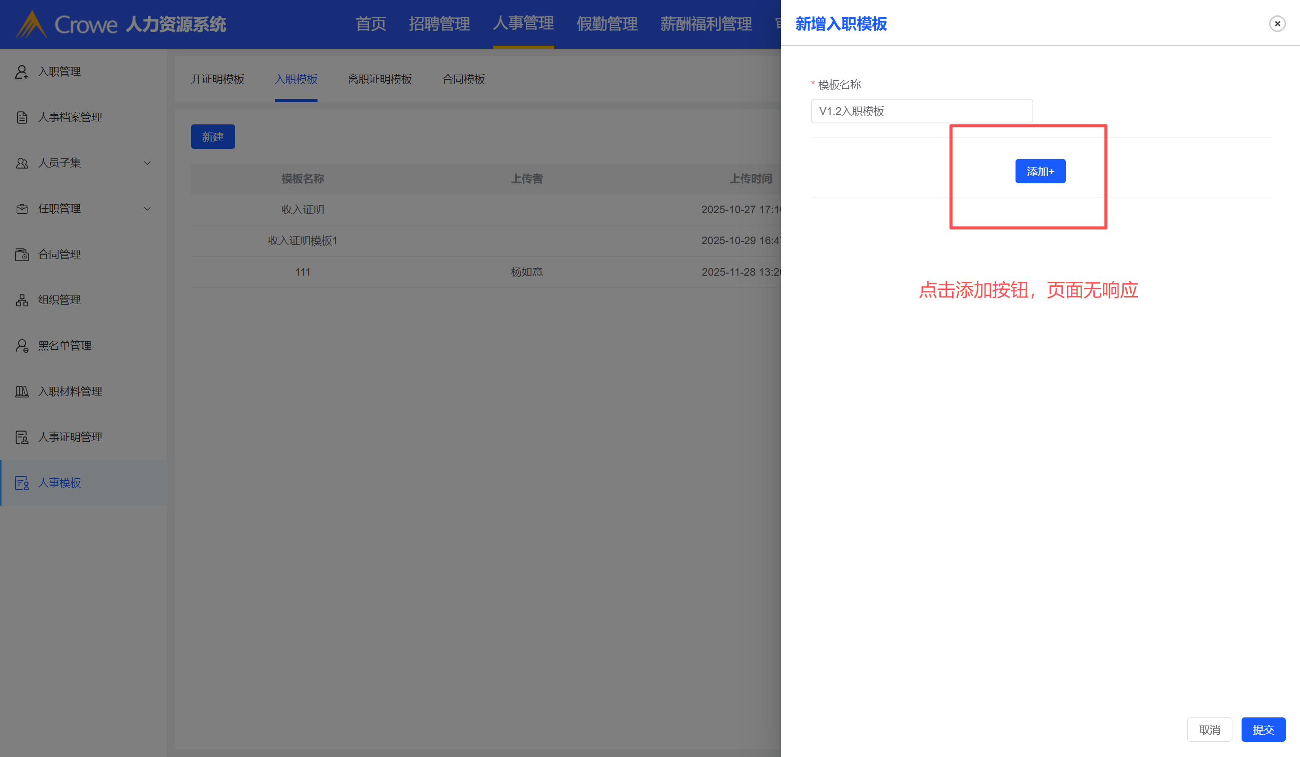 新增人事模板,点击添加按钮页面无响应