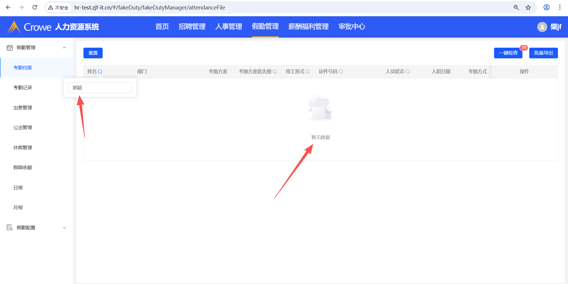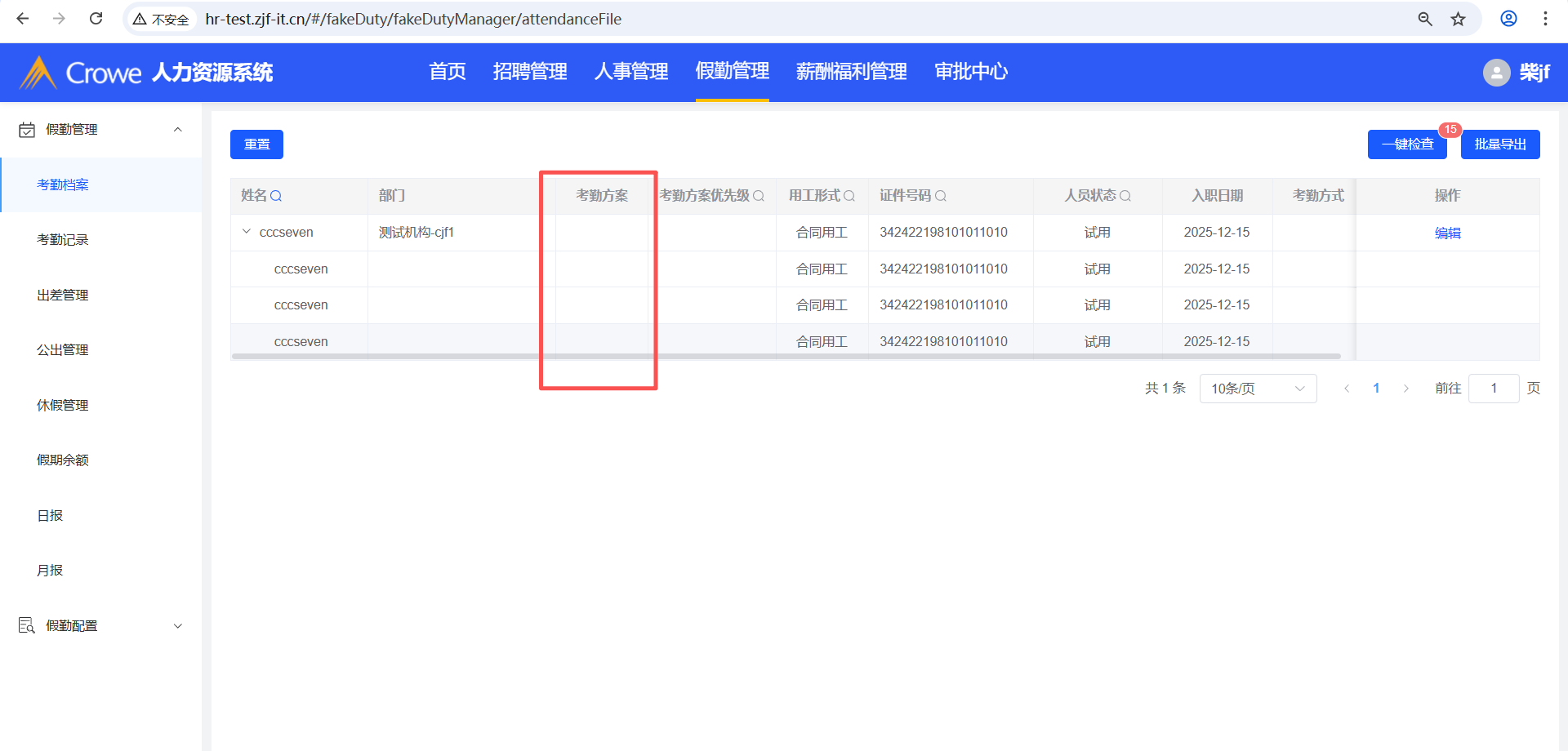 已关闭人力资源系统-假勤管理-考勤档案,没有考勤方案或者考勤方案都失效,只显示一条就行了
