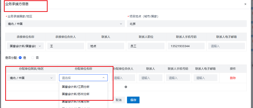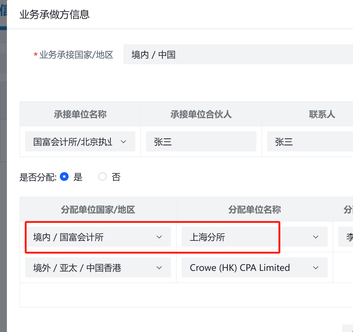 分布单位国家地区应该为,境内/中国,分配单位为:国富会计所/上海分所