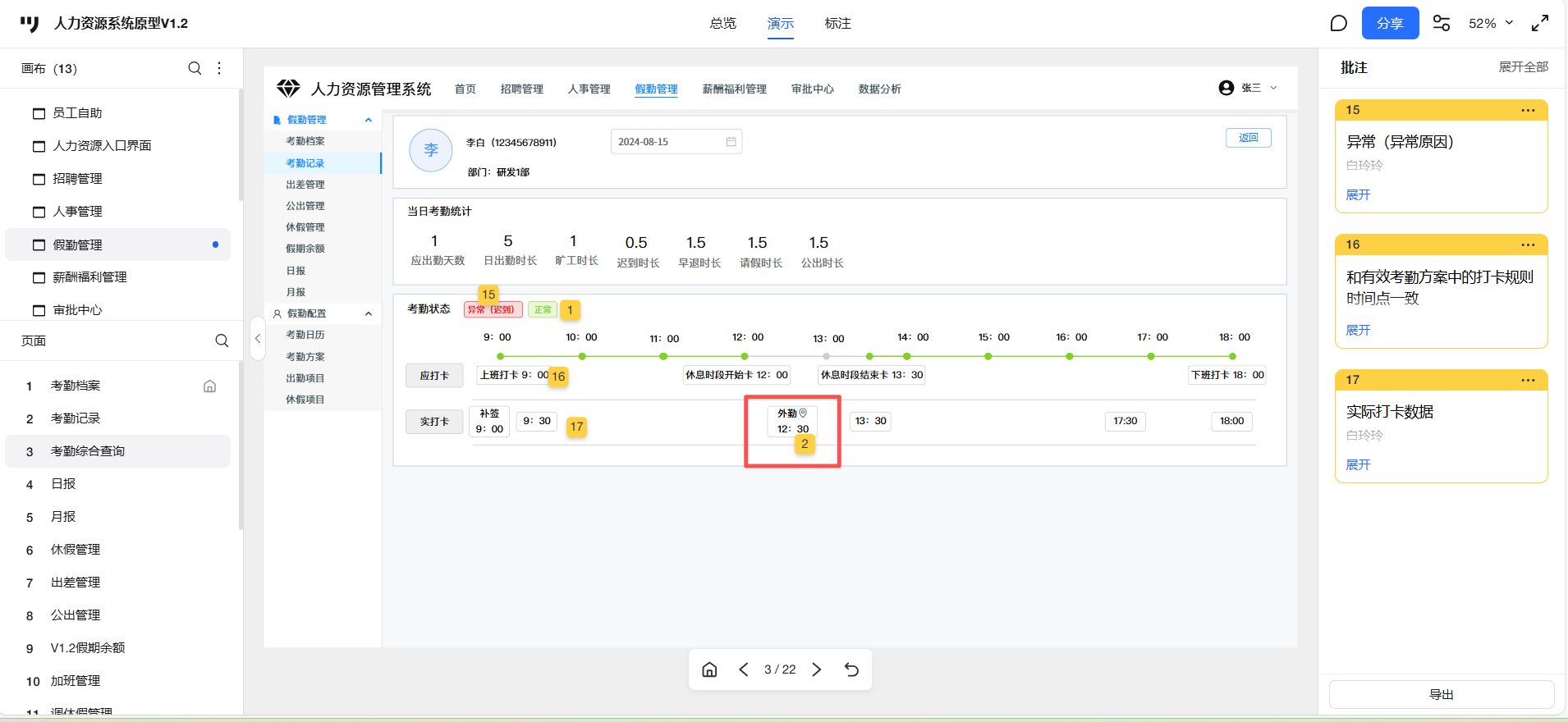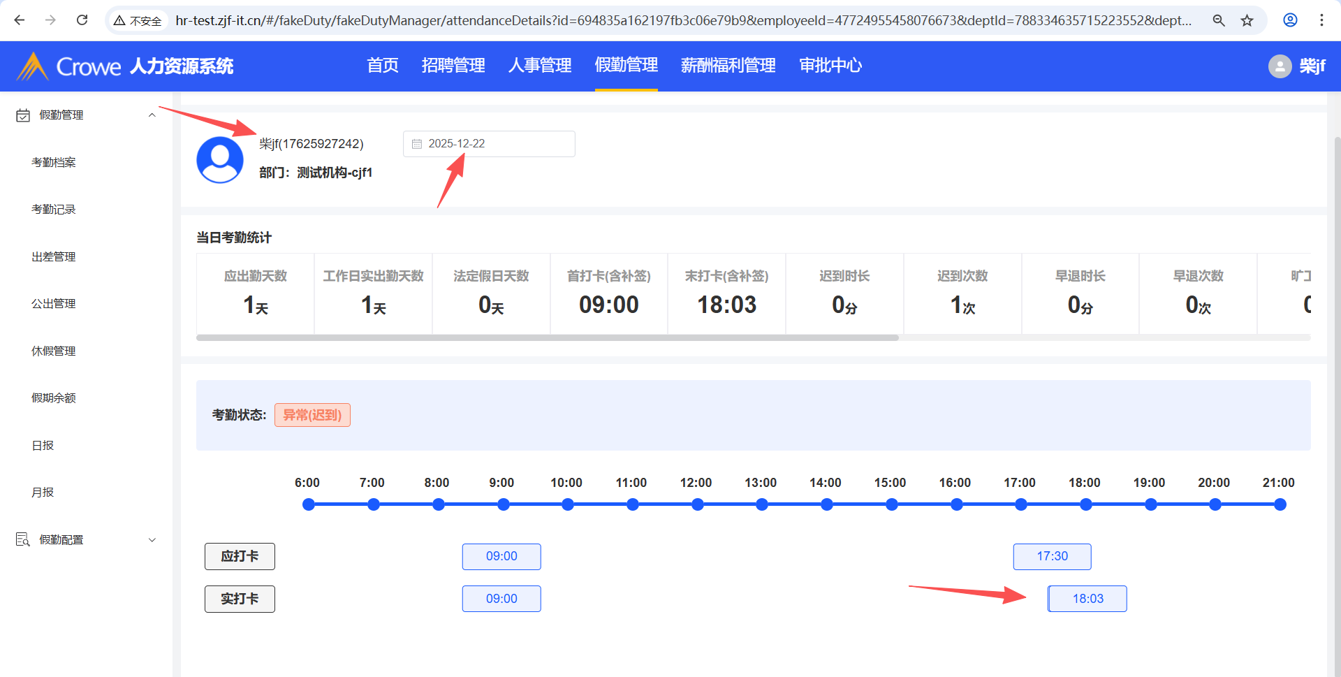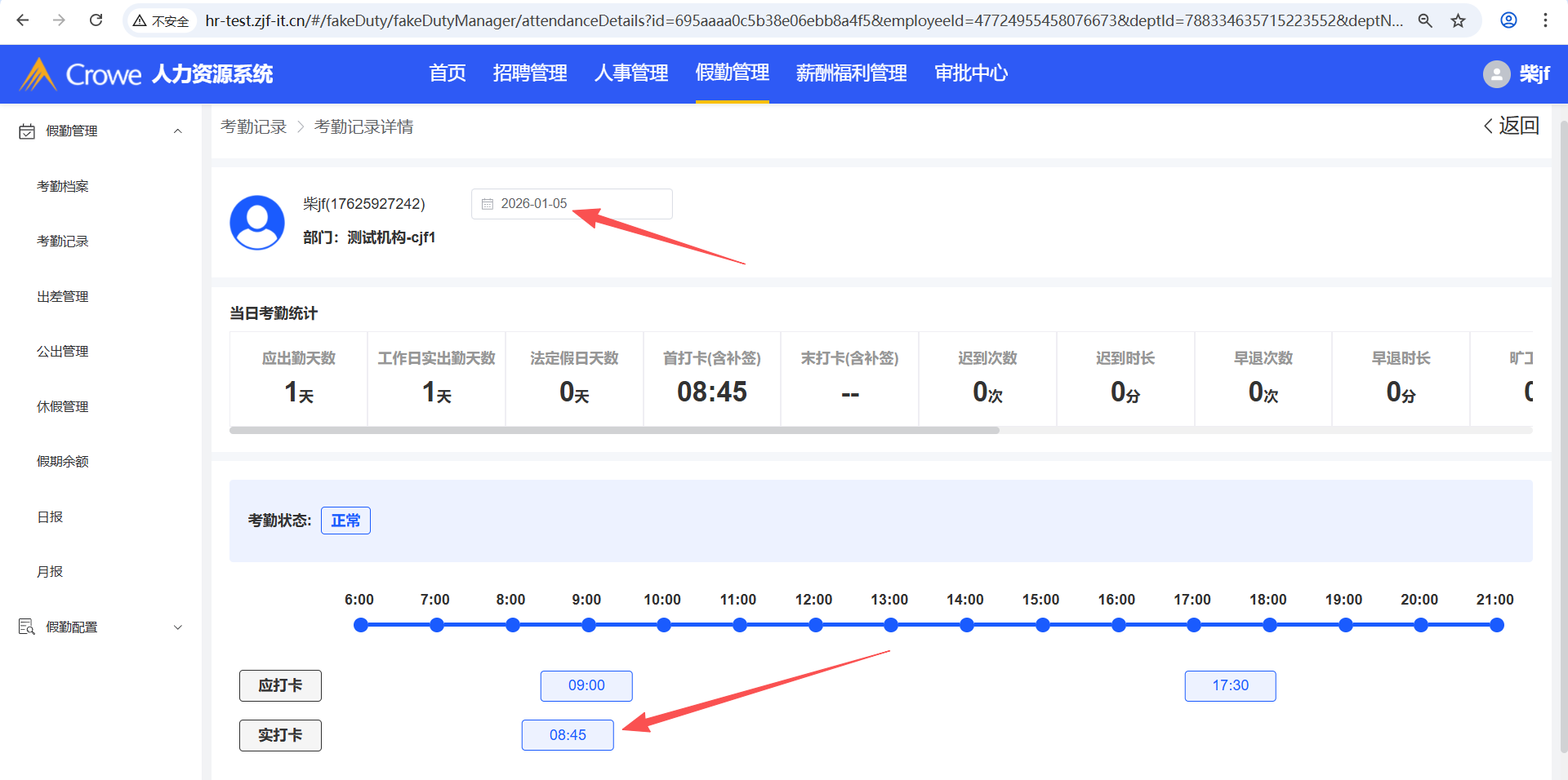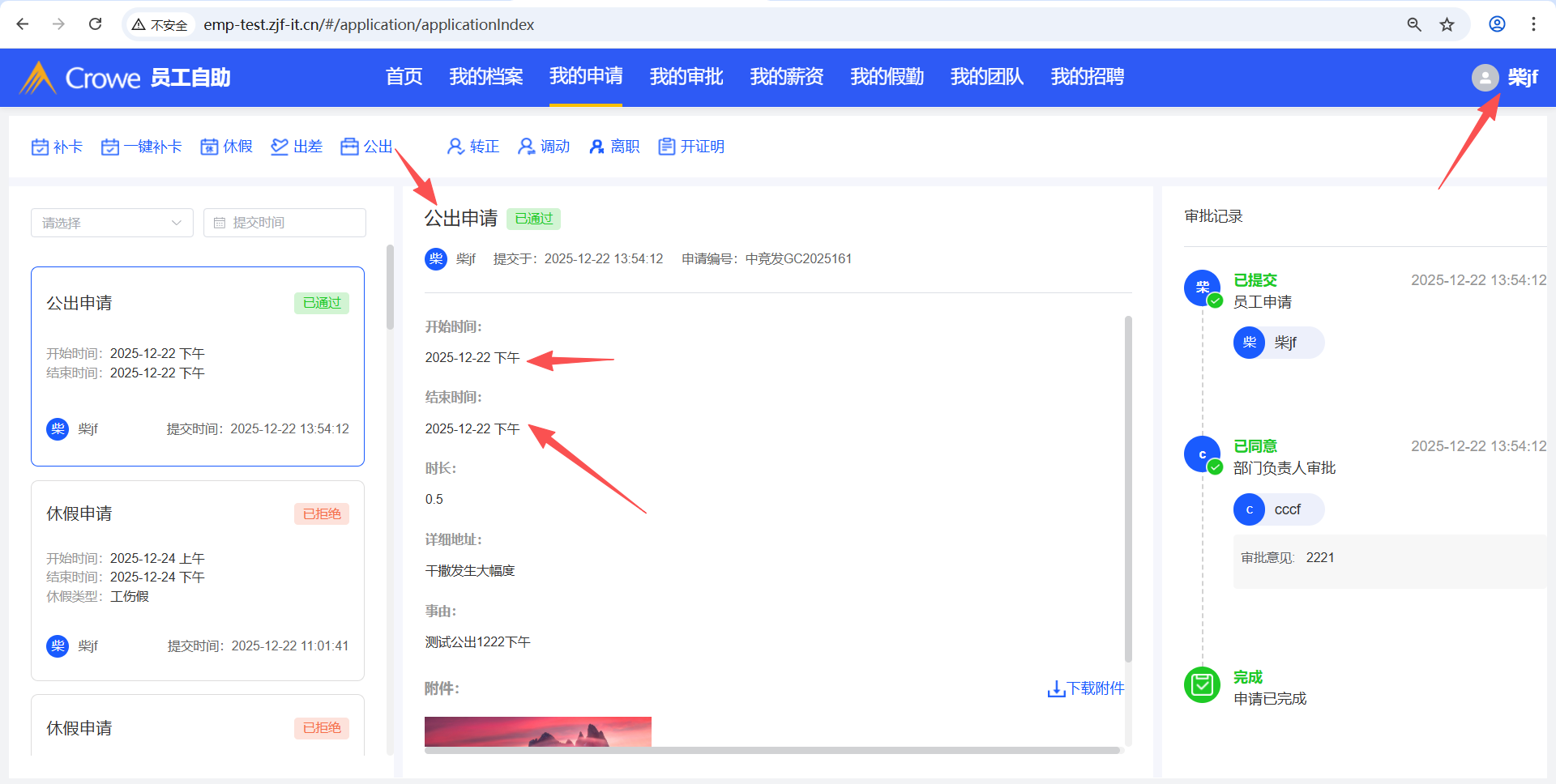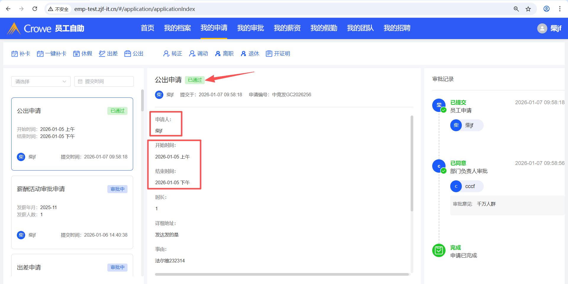 打开人力资源系统-假勤管理-考勤记录,公出申请通过后,打外勤卡,考勤记录的详情页未显示外勤