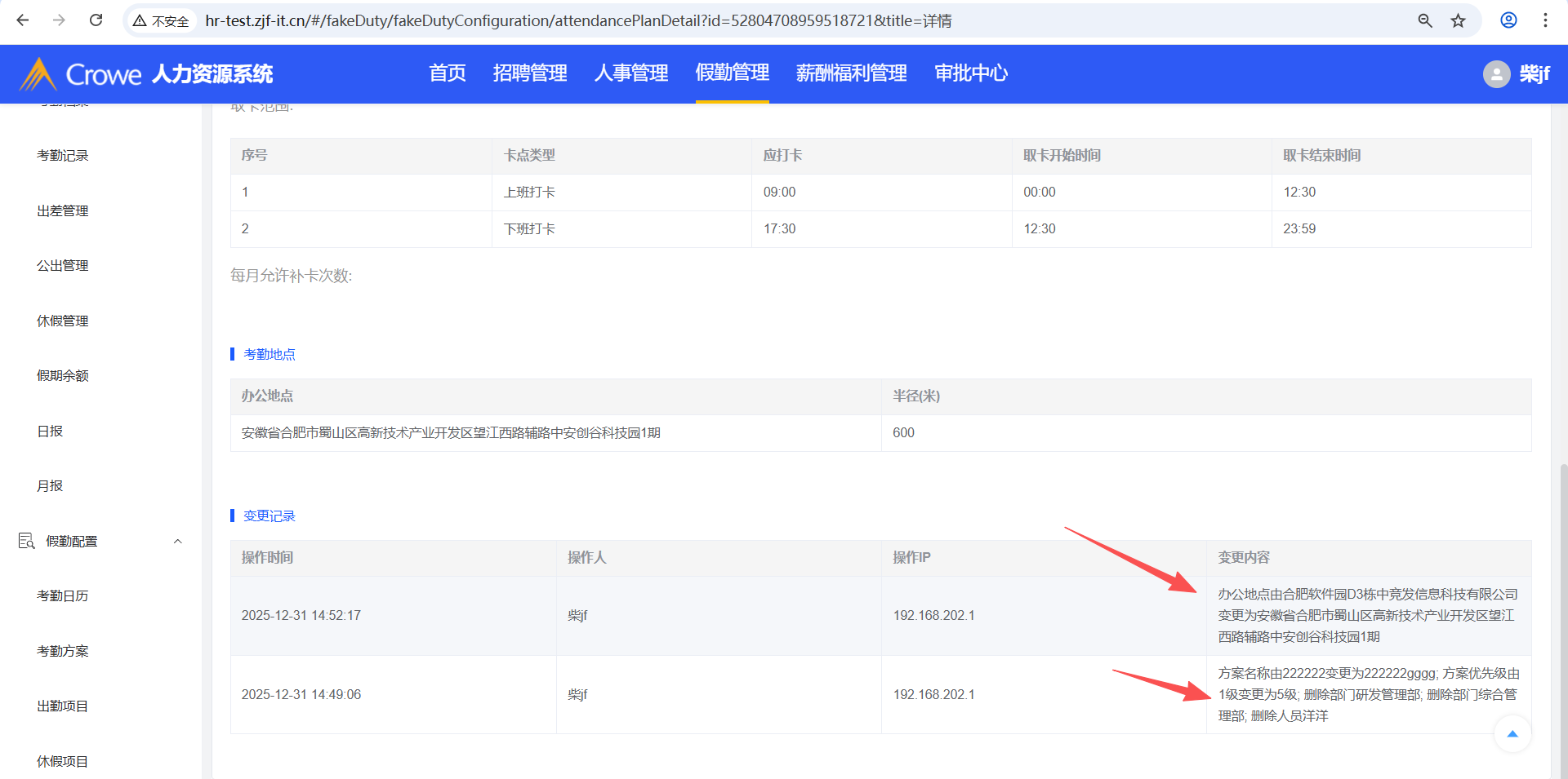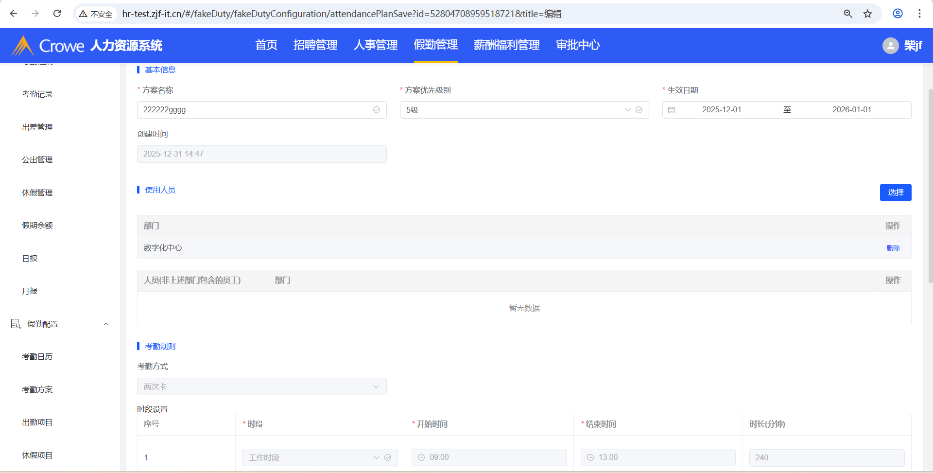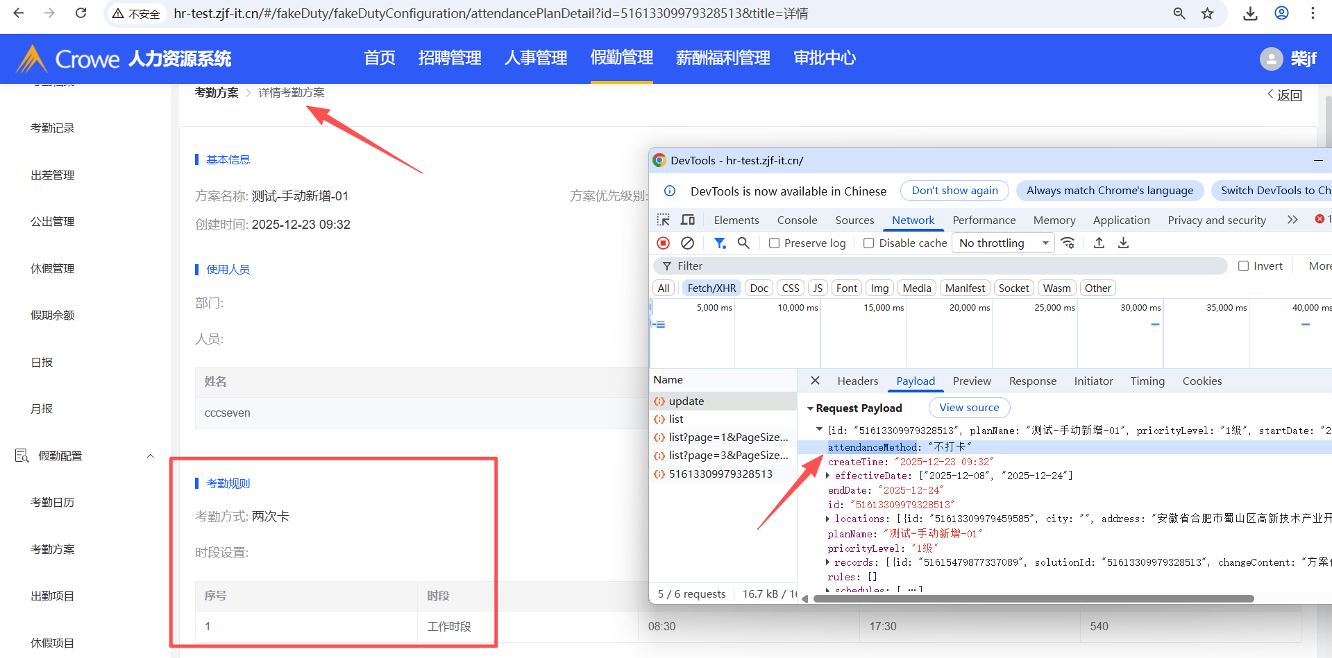 人力资源系统-假勤管理-考勤方案,编辑考勤方案的考勤规则后,进入详情仍显示编辑前的数据
