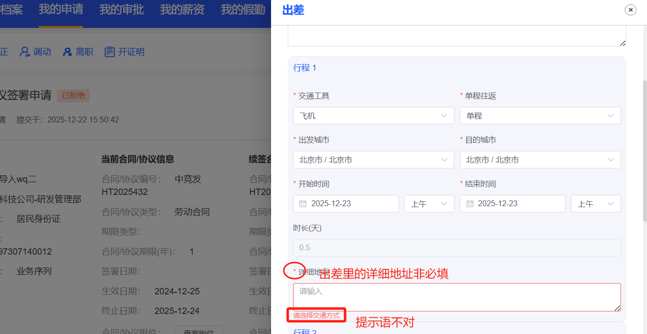 员工自助-我的申请:出差里的详细地址非必填,现在的提示语错误