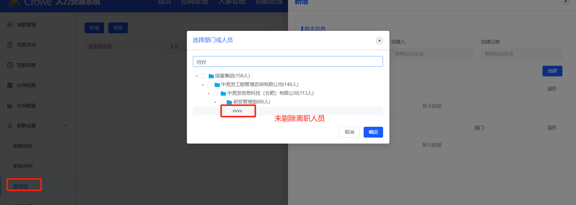 薪酬福利管理-薪酬设置-薪资组:新增选择人员时,未剔除离职人员