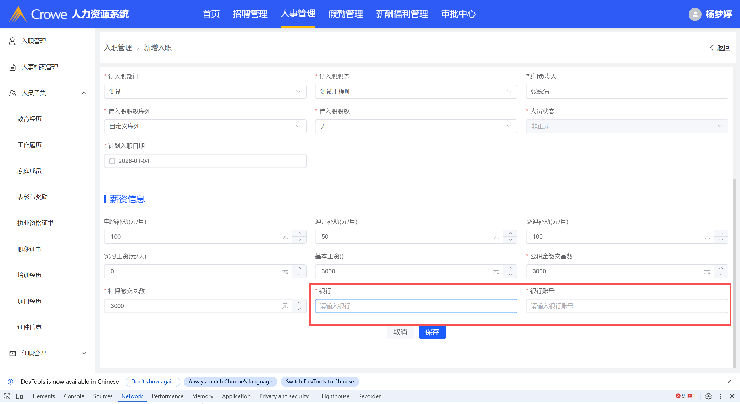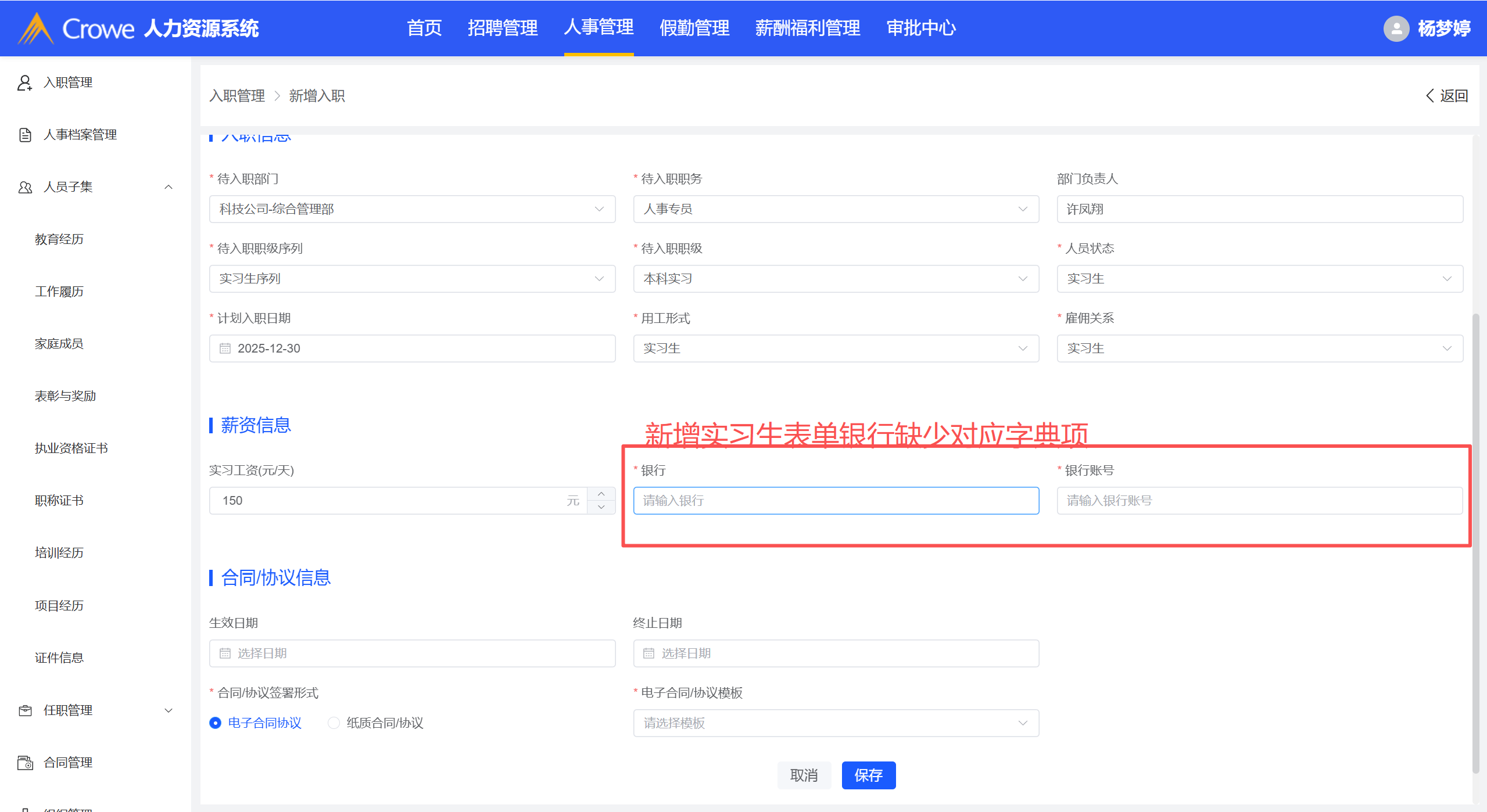 新增实习生表单银行缺少对应字典项