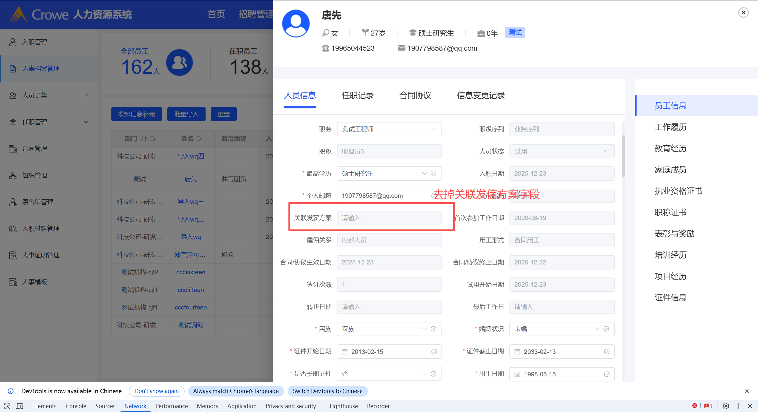 人事档案的人员信息需要去掉关联发薪方案字段
